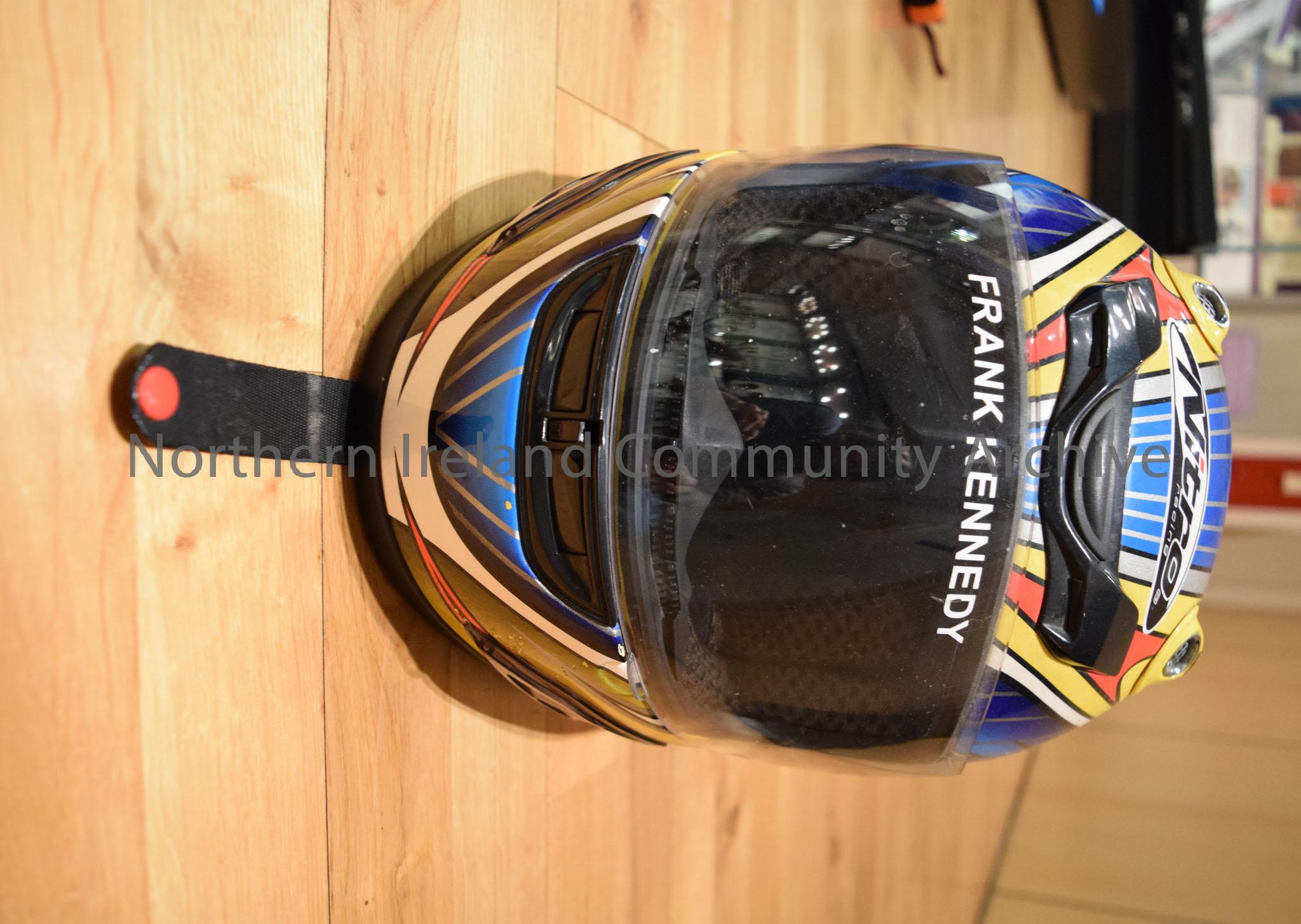 Nitro Racing motorcycle helmet belonging to Frank Kennedy. Yellow helmet with white, red and grey detail and dark blue and grey stripe pattern in the … – 2016.113 (2)
