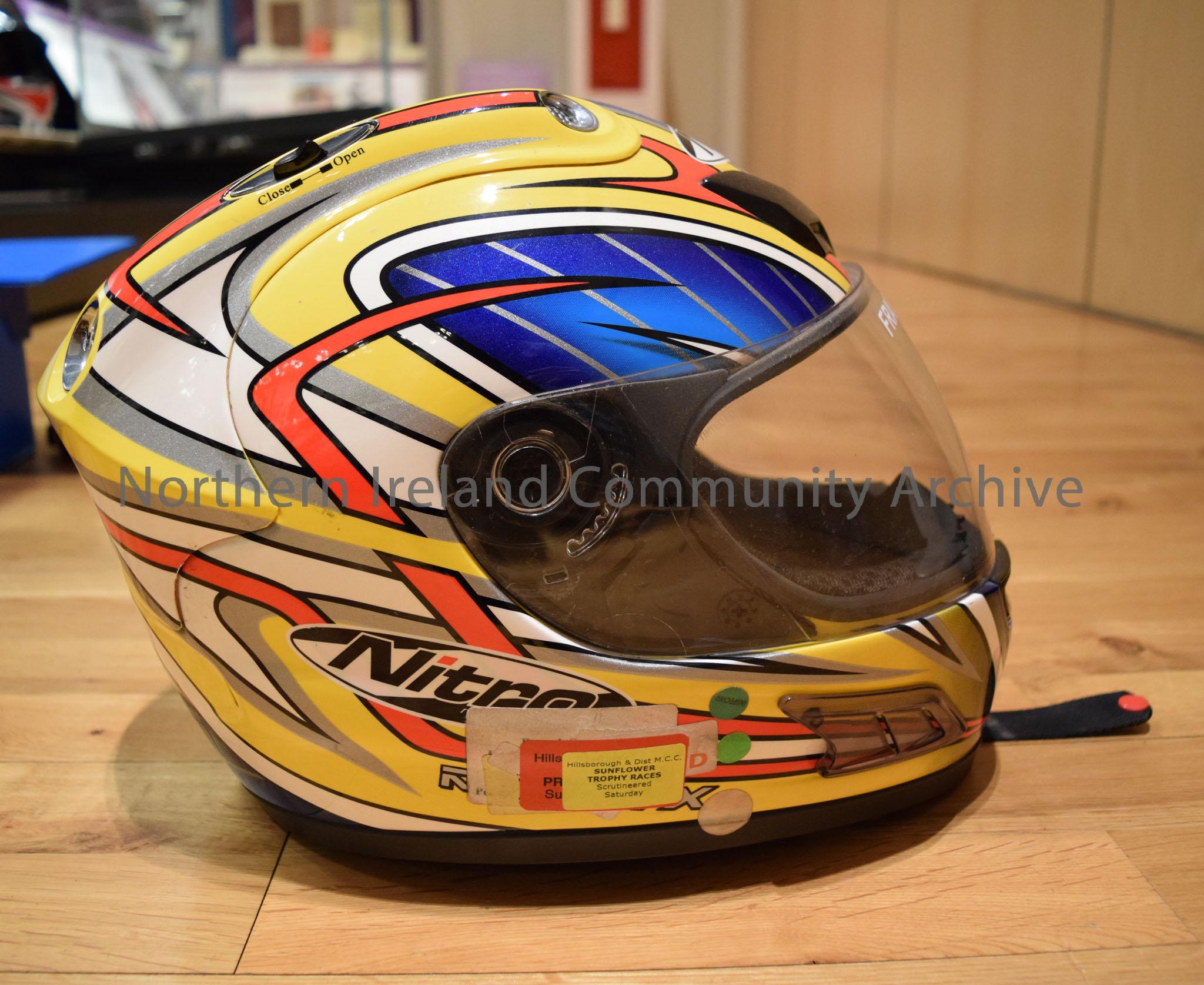 Nitro Racing motorcycle helmet belonging to Frank Kennedy. Yellow helmet with white, red and grey detail and dark blue and grey stripe pattern in the … – 2016.113 (5)