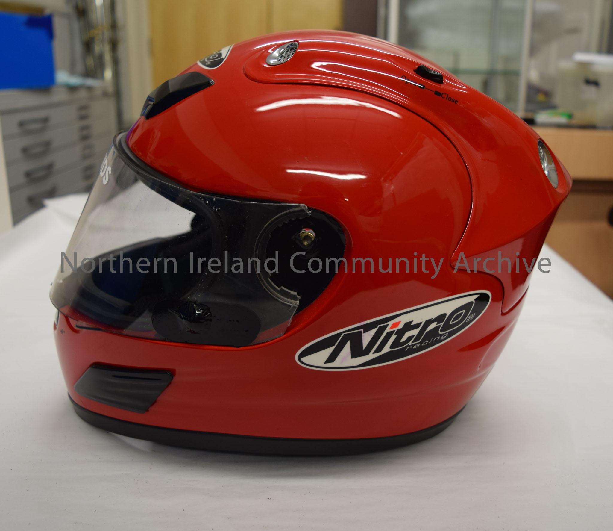 Nitro Racing motorcycle helmet belonging to Jack Sands. Plain red with silver vents.