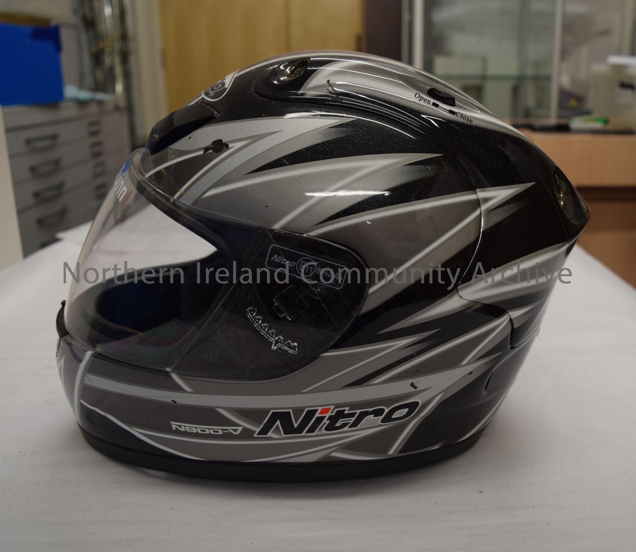 Nitro Racing motorcycle helmet belonging to Johnny Quinn. Shimmering black with grey and white “spiked” pattern. – 2016.69 (3)