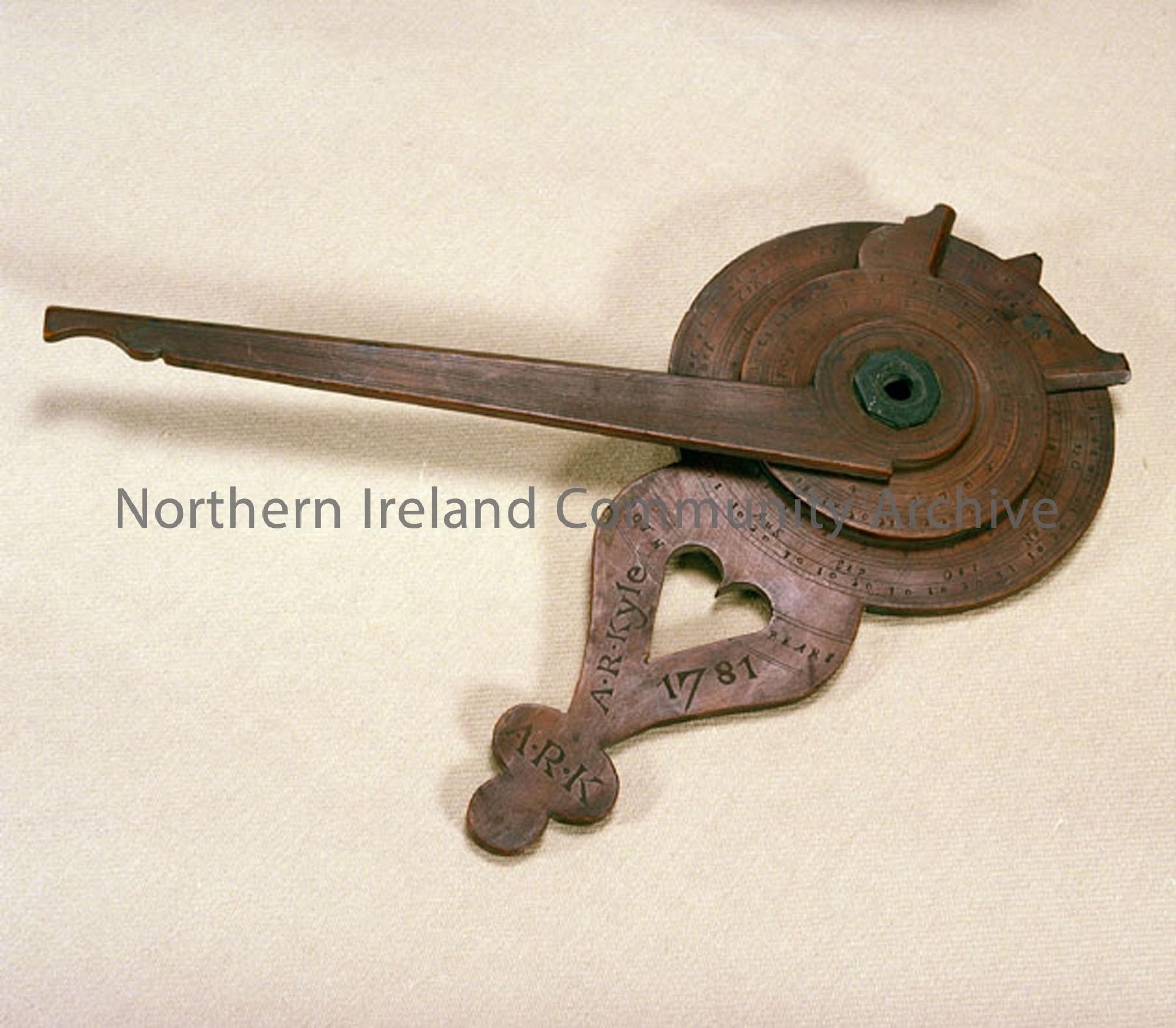 Nocturnal. Astronomical instrument, made of boxwood. Comprises of two circular shaped graduated pieces of wood, and a third piece with an extended arm…