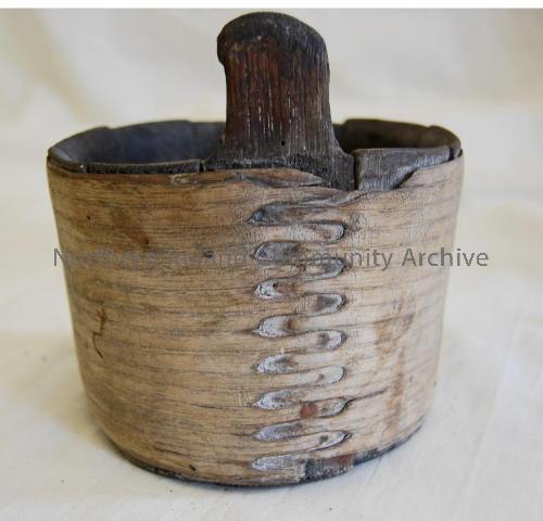 A smaller version of the piggin. Used as a porridge bowl. Made of staves but enclosed by a thin veneer of sycamore or birch instead of metal hoops. The veneer is fastened by a lap joint. Courtesy of Ballycastle Museum.