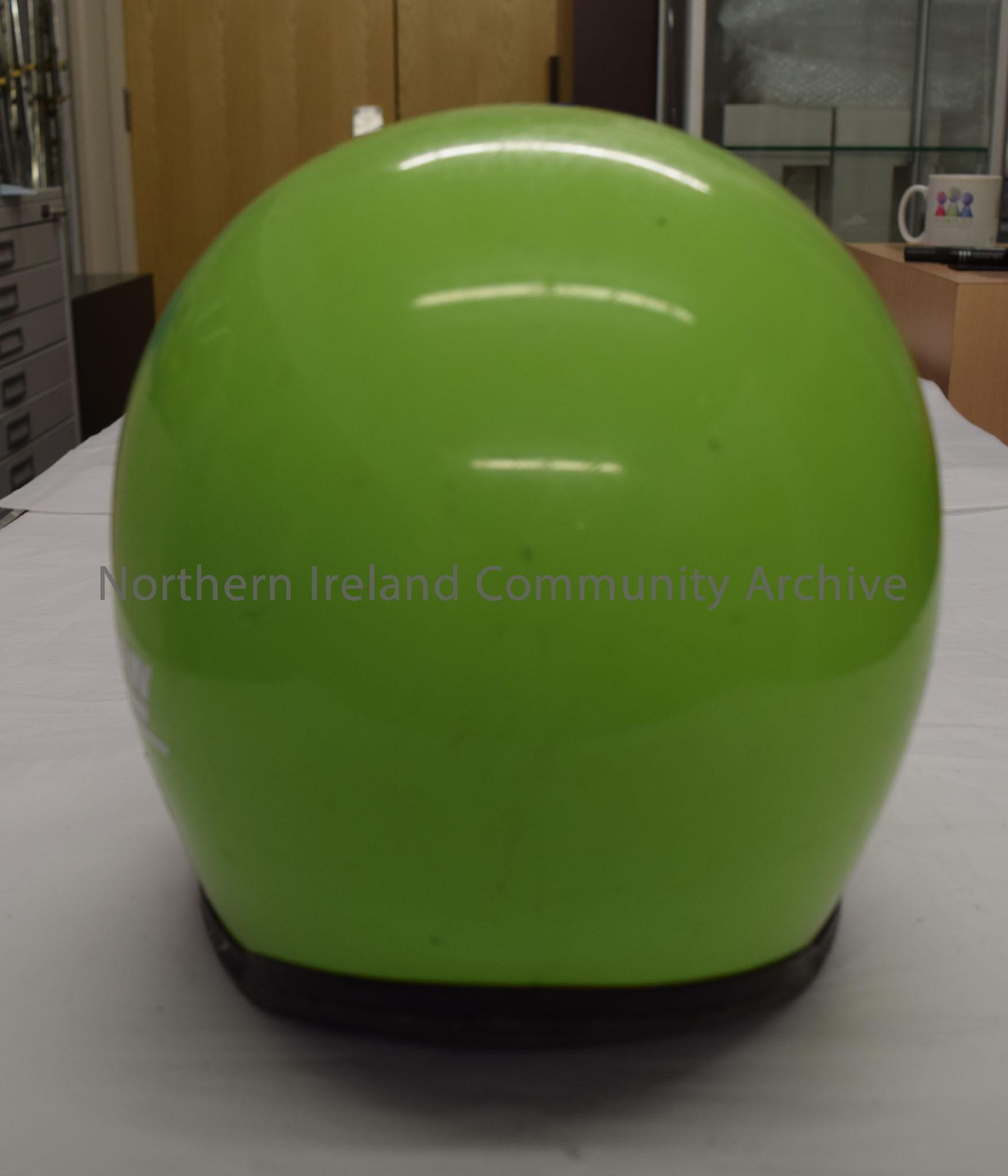 Nolan motorcycle helmet belonging to Ben Harris. Plain lime green