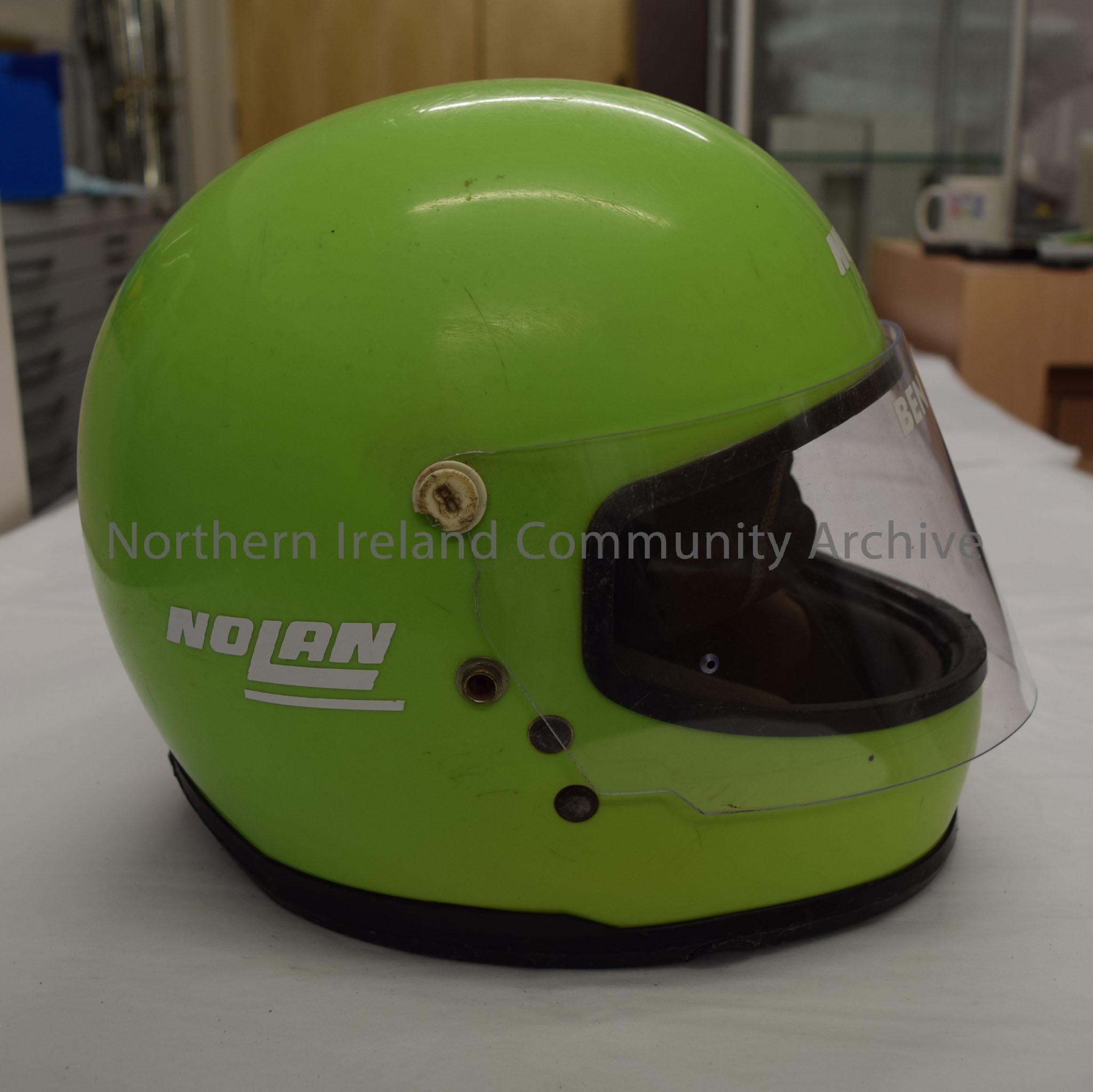 Nolan motorcycle helmet belonging to Ben Harris. Plain lime green