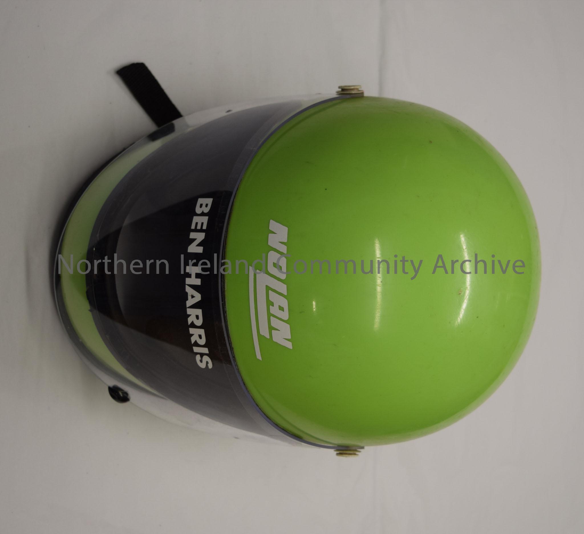 Nolan motorcycle helmet belonging to Ben Harris. Plain lime green
