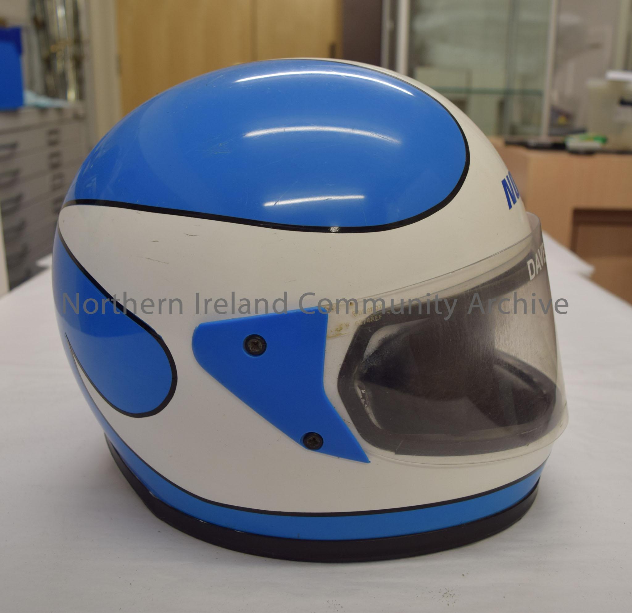 Nolan motorcycle helmet belonging to Dave Clarke. Blue helmet with white front leading back to five points