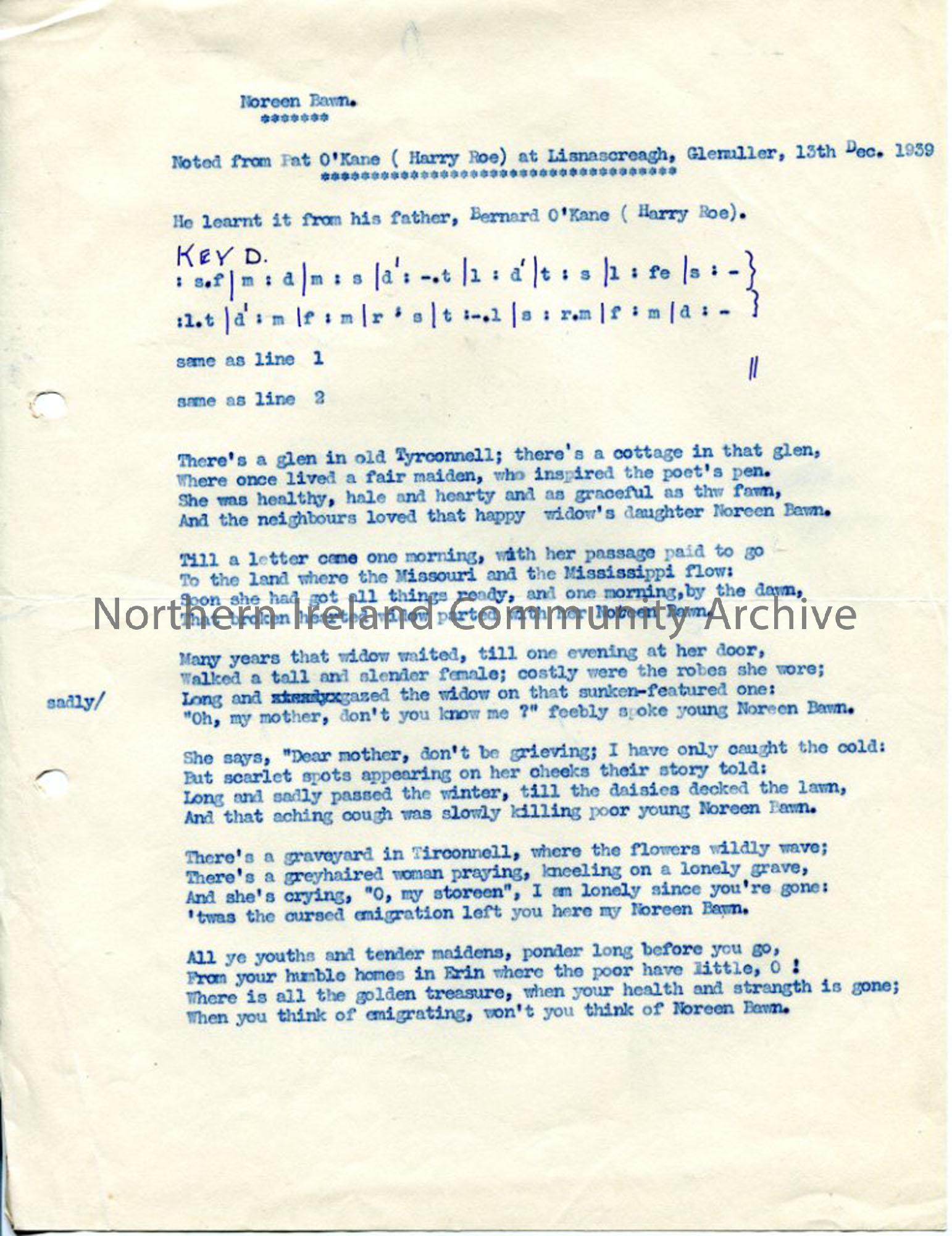 Typed words and tonic sol-fa notation to 'Noreen Bawn'. Donor - ‘noted from’ O'Kane, Pat. Learned it from his father Bernard O'Kane - both also known as Harry Roe.