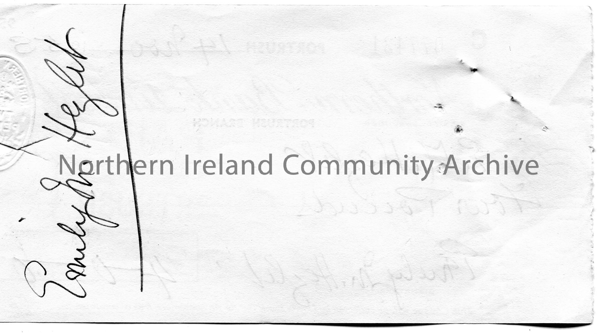 Northern Bank Limited, Portrush branch, cheque. Dated 14th November, 1953. Payable to E. M. Hezlet from Emily M. Hezlet for £4.0.0. Paid stamp on front dated 16 December, 1953. Emily M. Hezlet signature on reverse. Triangle cut out of edge of cheque.
