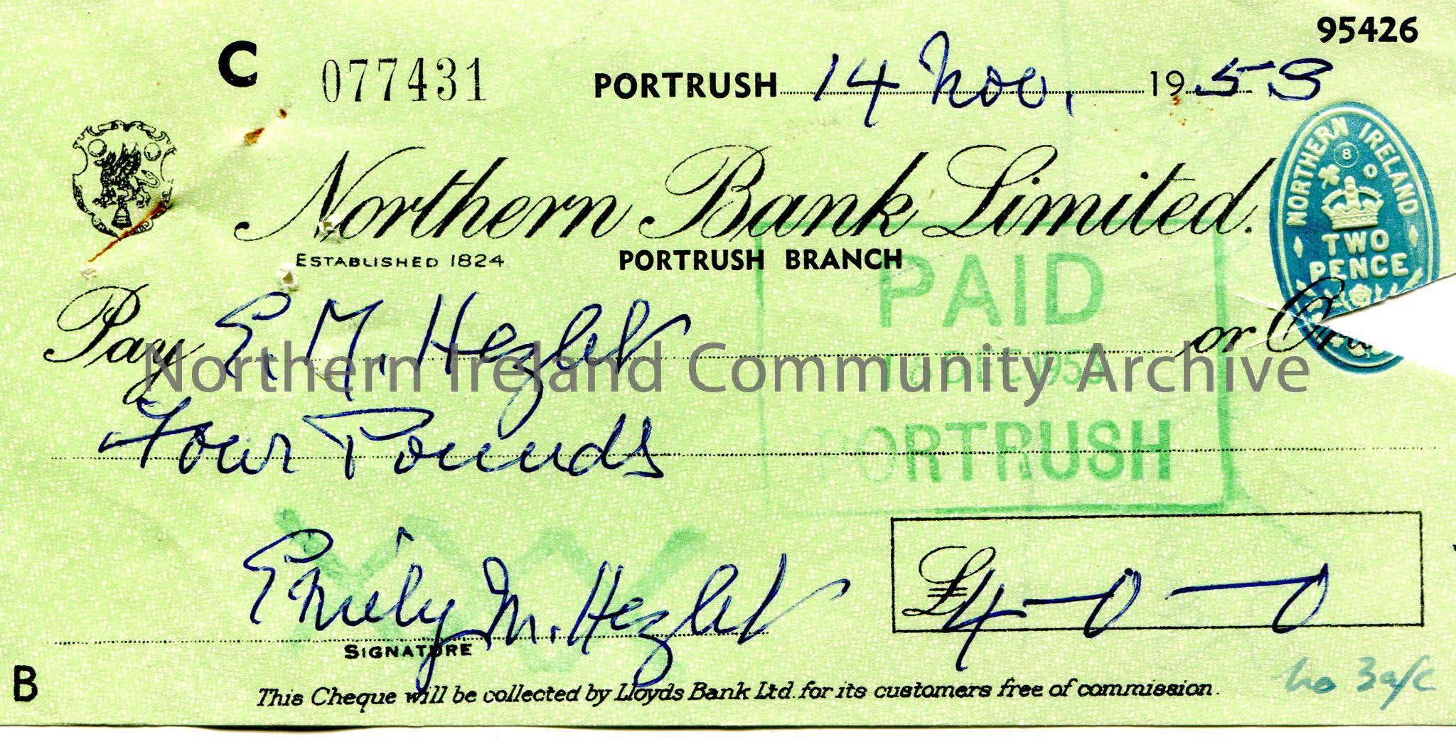 Northern Bank Limited, Portrush branch, cheque. Dated 14th November, 1953. Payable to E. M. Hezlet from Emily M. Hezlet for £4.0.0. Paid stamp on…