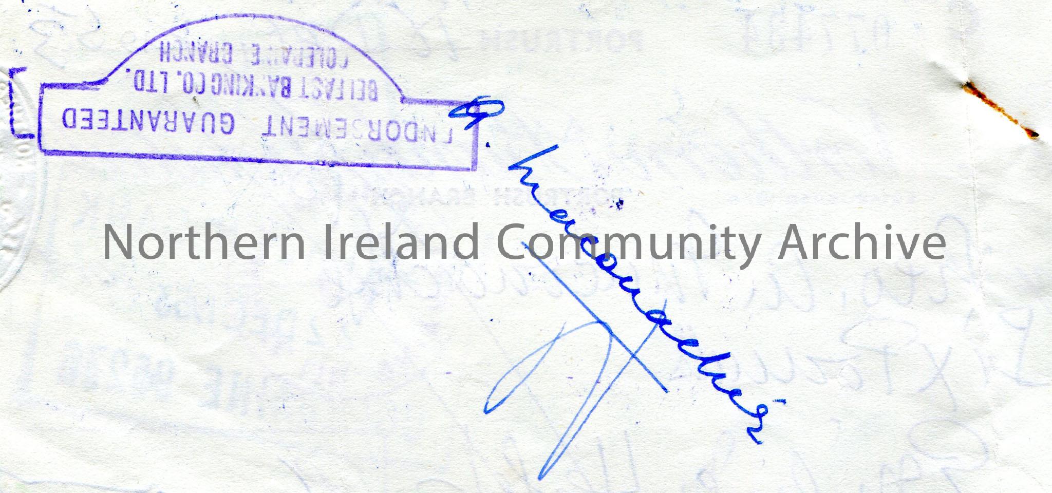 Northern Bank Limited, Portrush branch, cheque. Dated 18th December, 1953. Payable to Rev A. Maconachie from Emily M. Hezlet for £6.0.0. Three stamps on front - Paid stamp, Northern Bank and Belfast Banking Co. Ltd. A. Maconachie signature on reverse along with stamp of Belfast Banking Co. Ltd. Triangle cut out of edge of cheque.