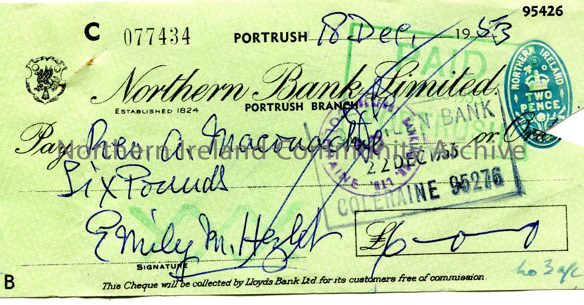 Northern Bank Limited, Portrush branch, cheque. Dated 18th December, 1953. Payable to Rev A. Maconachie from Emily M. Hezlet for £6.0.0. Three st…