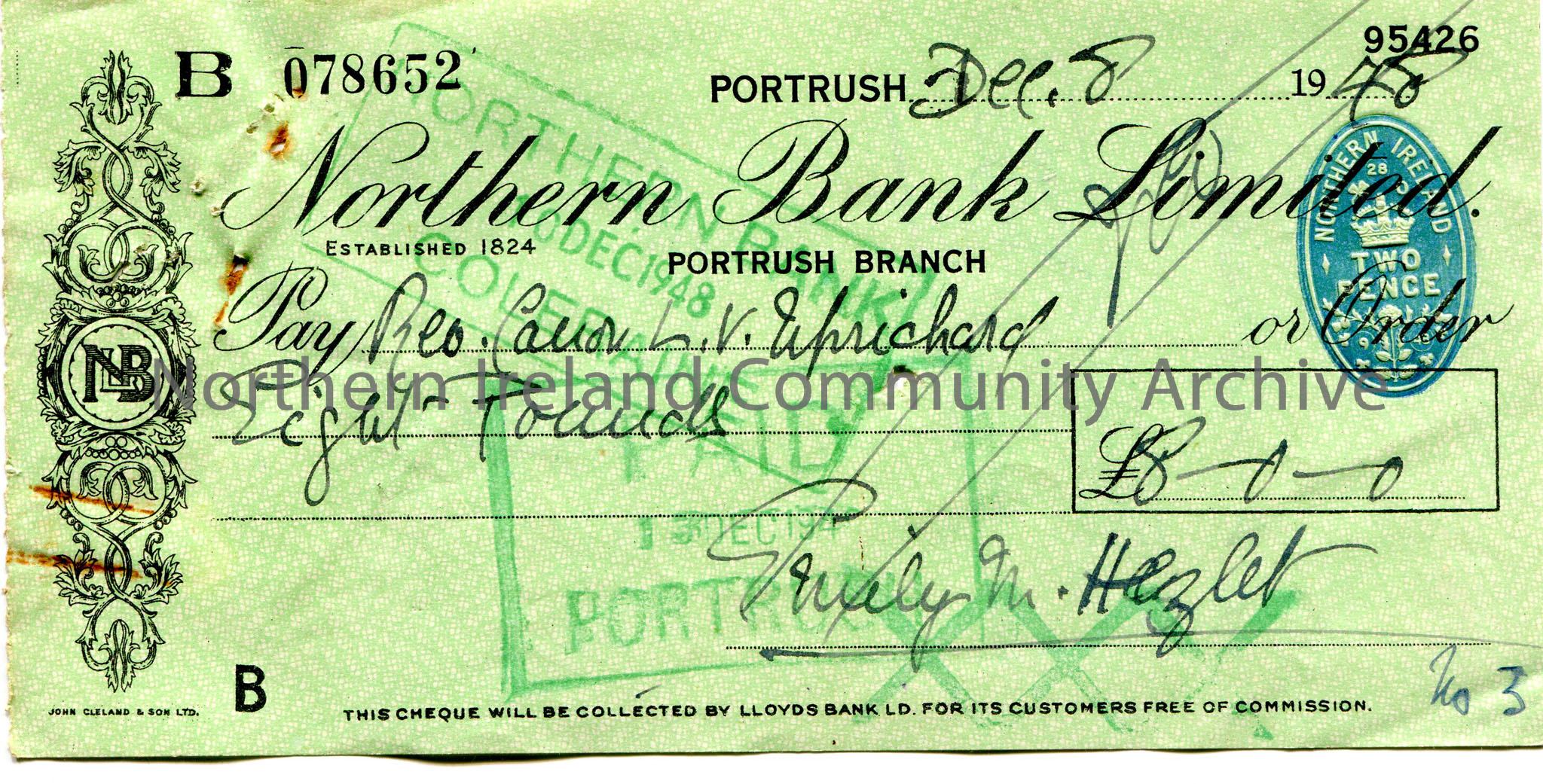 Northern Bank Limited, Portrush branch, cheque. Dated 8th December, 1948. Payable to Rev Canon L. V. Uprichard from Emily Hezlet for £8.0.0. Scored out with two green Northern Bank stamps on front dated 10th December 1948 and 13th December, 1948. L. V. Uprichard handwritten on reverse along with two Ulster Bank stamps, Coleraine.