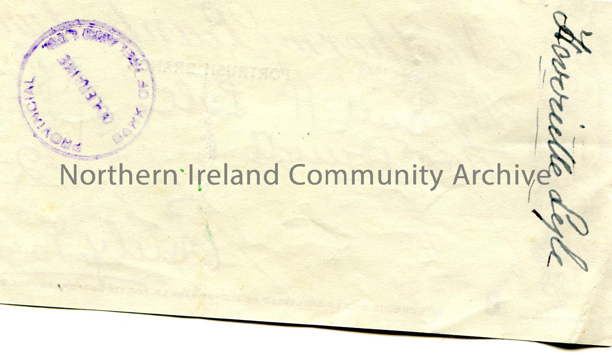 Northern Bank Limited, Portrush branch, cheque. Dated 8th December, 1950. Payable to Miss H. Lyle from Emily M. Hezlet for £2.0.0. Scored out on front. Northern Bank, Coleraine 18th December, 1950 and Paid stamps on front. Signed on reverse by Harriette Lyle. Provincial Bank of Ireland, Coleraine stamp on reverse.