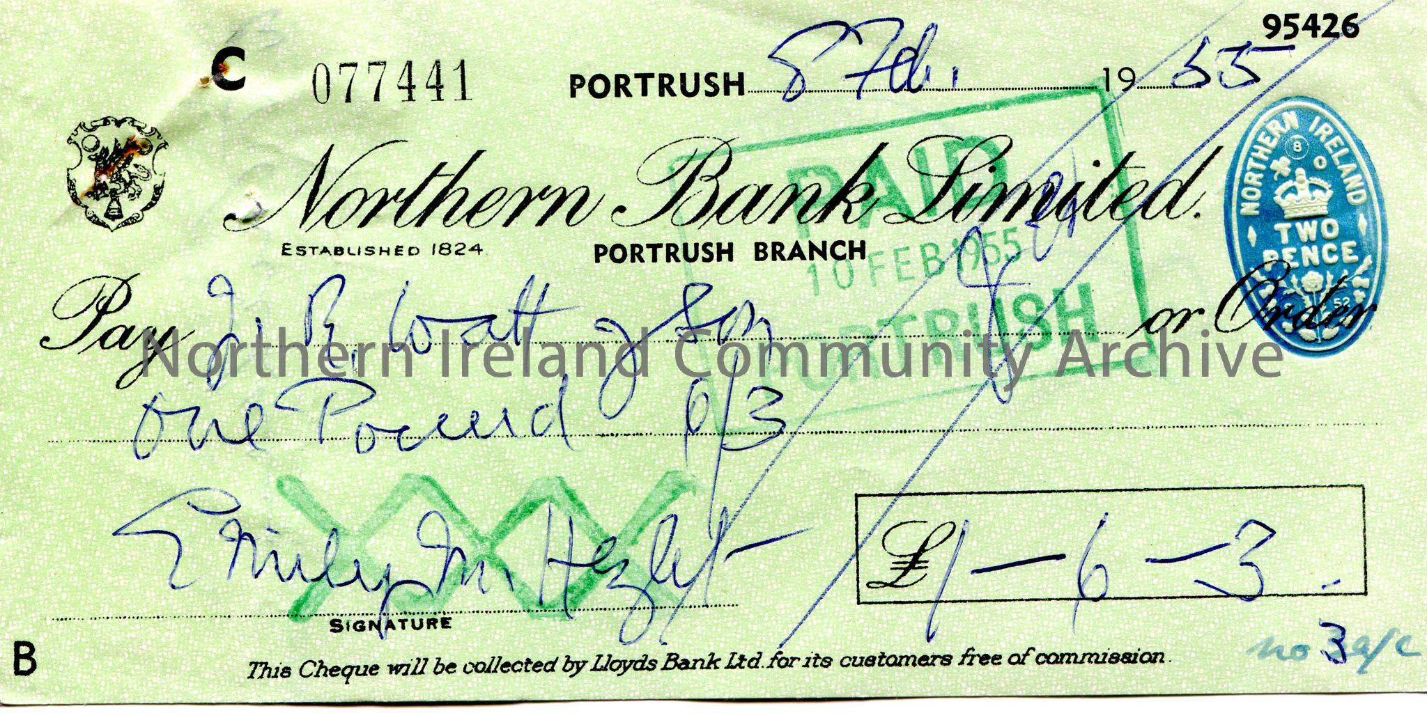 Northern Bank Limited, Portrush branch, cheque. Dated 8th February, 1955. Payable to J. R. Watt & Son from Emily M. Hezlet for £1.6.3. Scored out…