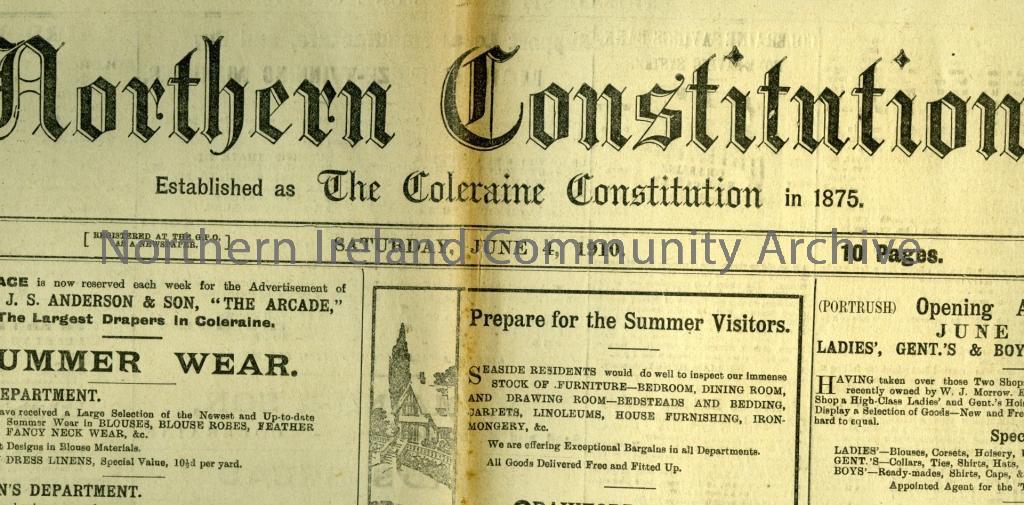 Newspaper titled, 'Northern COnstitution' dated Saturday, June 4, 1910. 10 pages long, costing one penny. Features various articles on the front page deatiling 'summer wear,' 'Fountain pens' and 'Annan Oil Engines.'