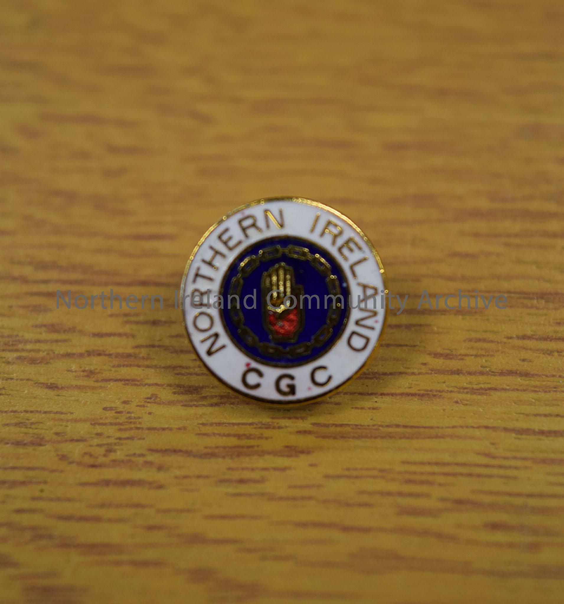 Northern Ireland Commonwealth Games Council badge. White circular badge with blue circle featuring gold chain surrounding the red hand of Ulster.