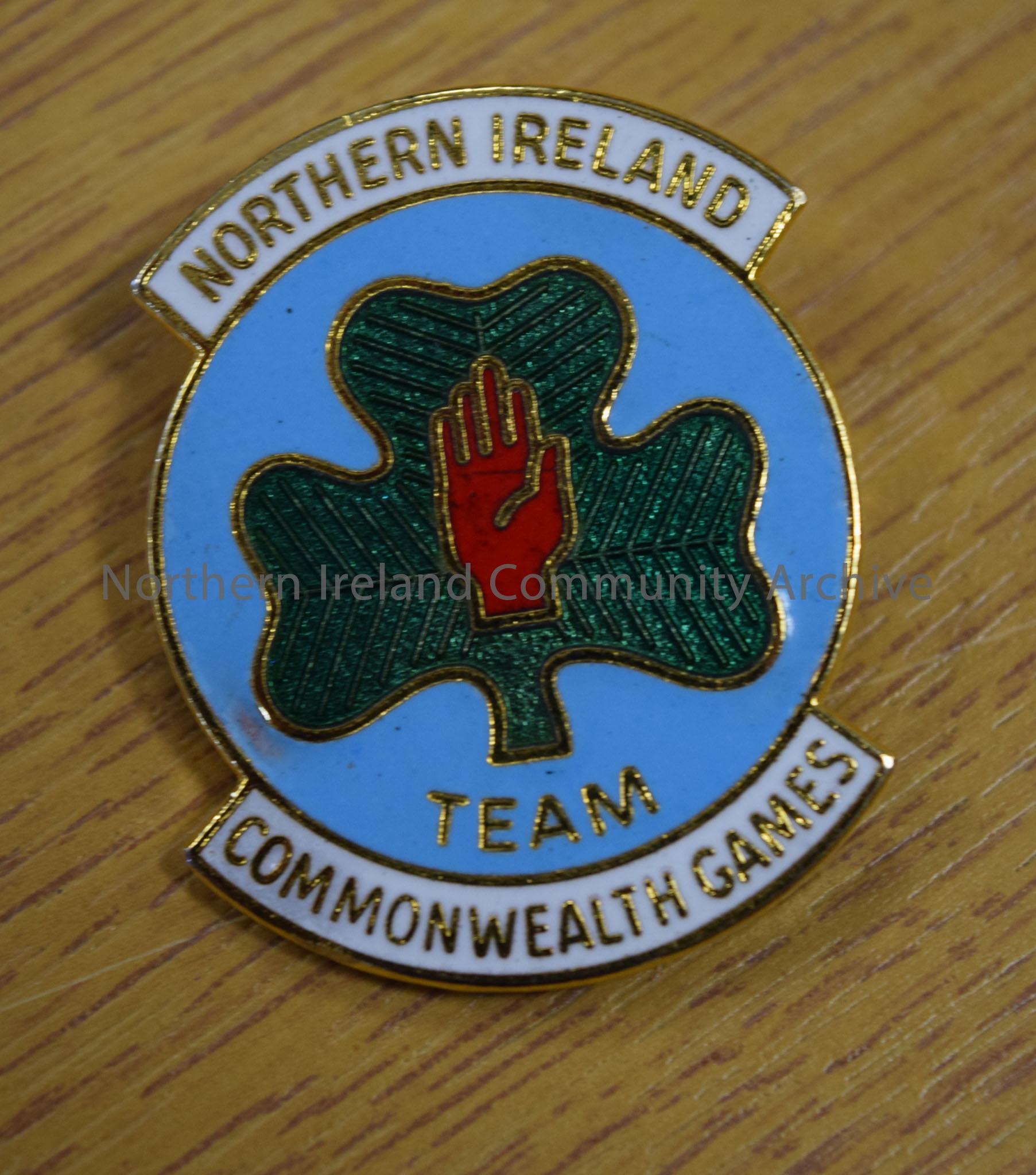 Northern Ireland Commonwealth Games team badge. Blue background with green shamrock featuring red hand of Ulster