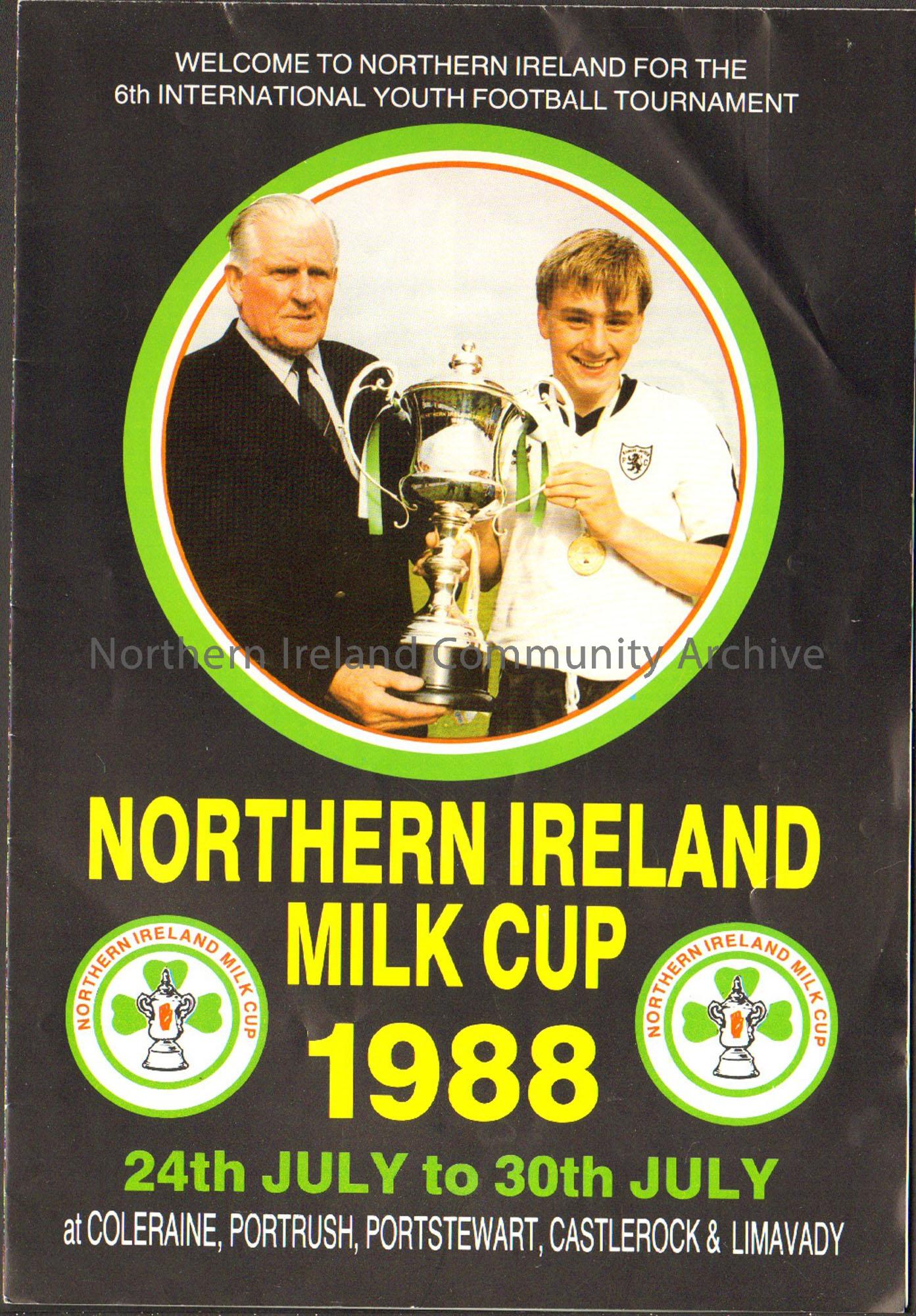 Northern Ireland Milk Cup 1988. Entry form to the 6th edition of the tournament. Black cover with yellow writing and a circular photograph with green …