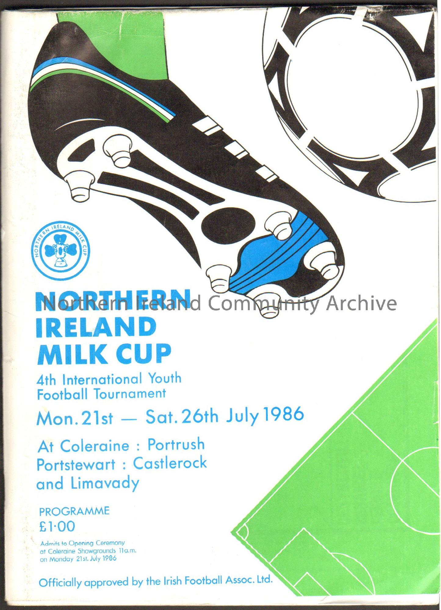 Northern Ireland Milk Cup. 4th International Youth Tournament, 1986. White programme cover with image of a boot with green socks kicking a ball and a …