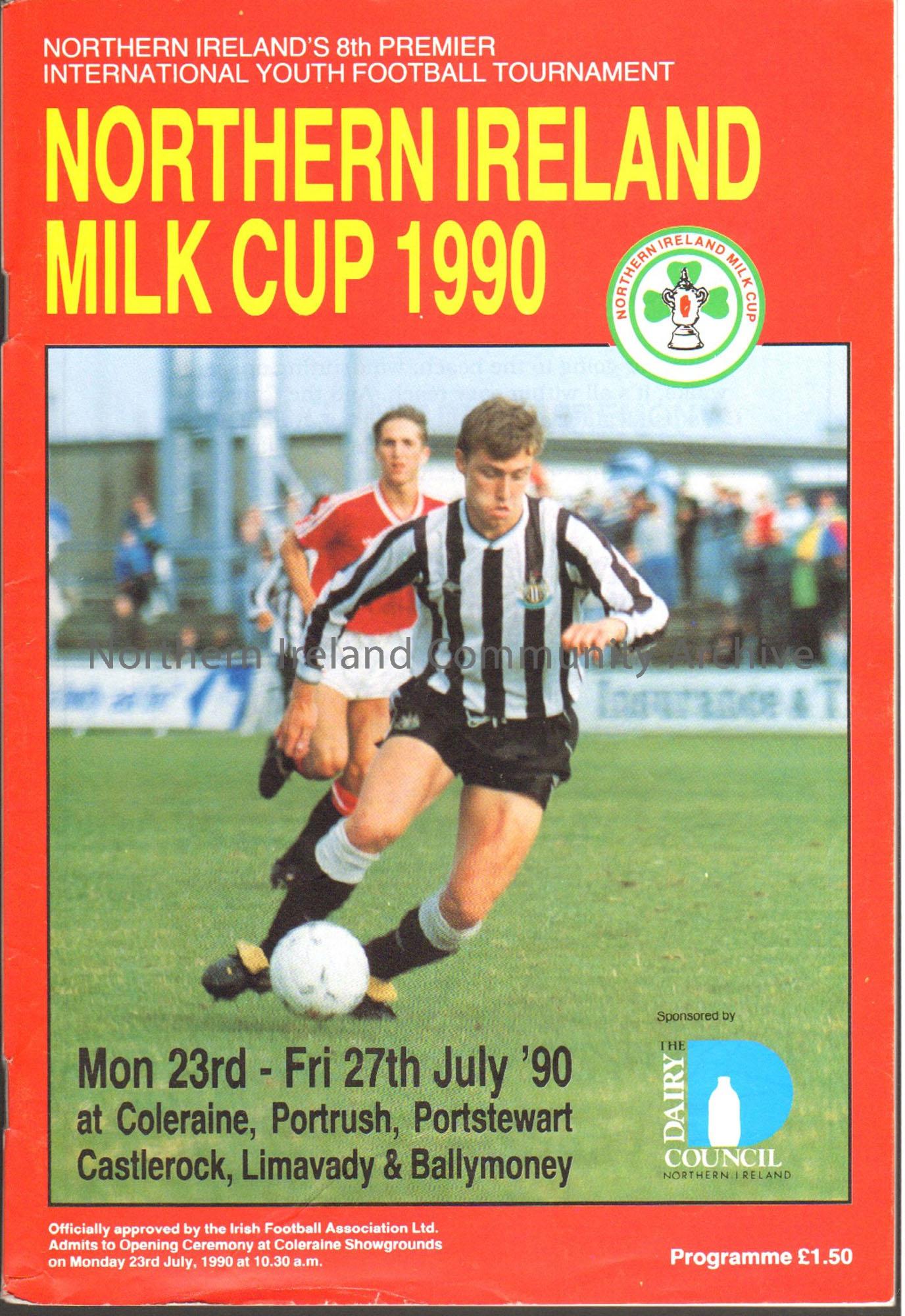 Northern Ireland Milk Cup. 8th Premier International Youth Tournament, 1990. Red cover with yellow writing and a photograph of a Newcastle (black and …