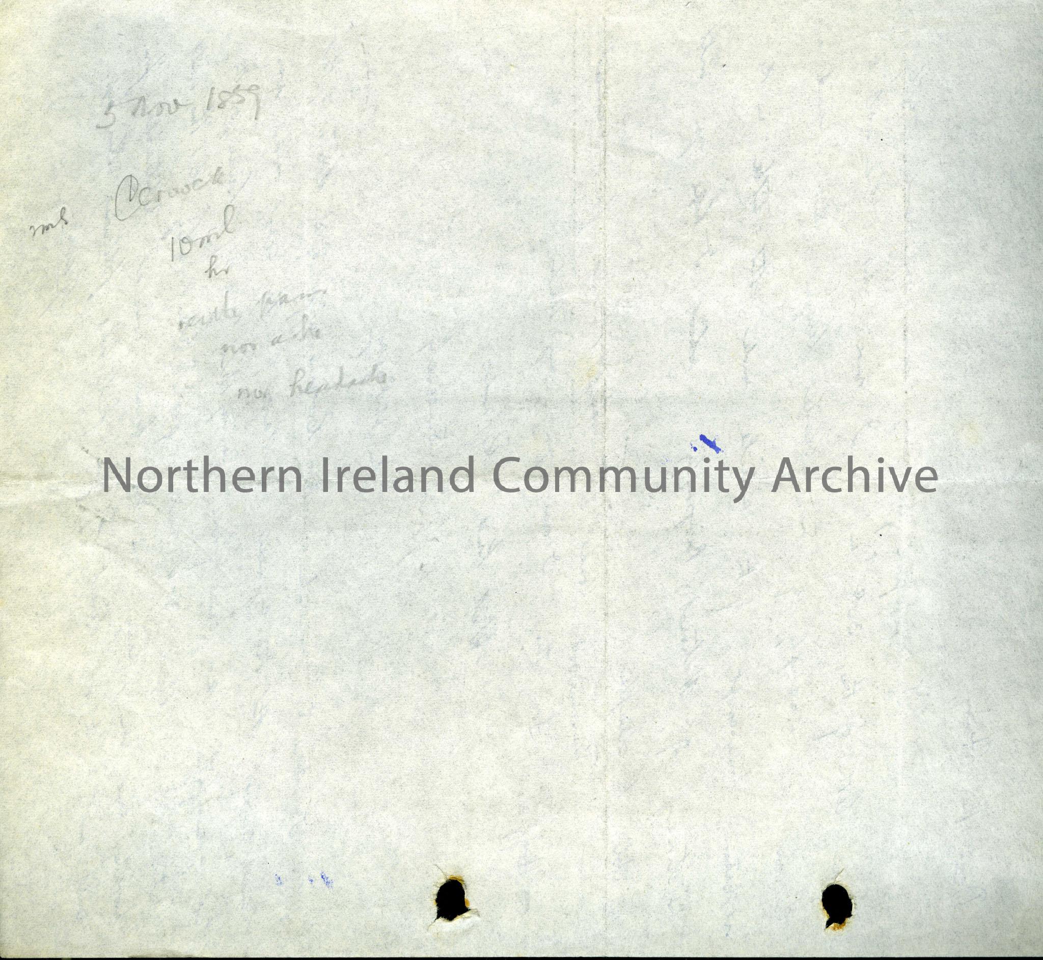 Note jotted on the back of a letter and dated, Dervock, 5th November, 1859