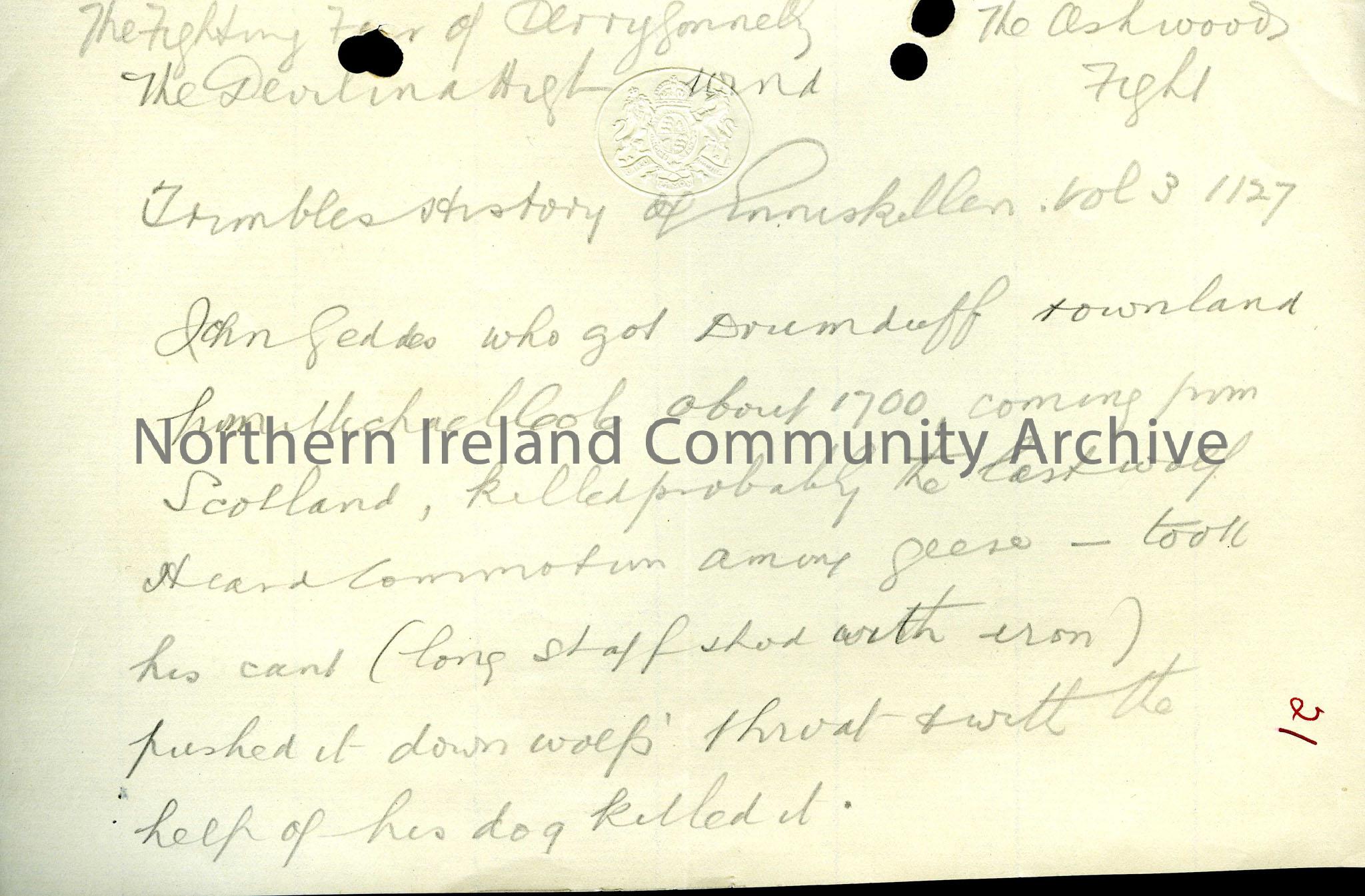 Note taken from "Trimble's History of Enniskillen" Vol 3, 1127 describing the killing of the last wolf by John Geddes.
