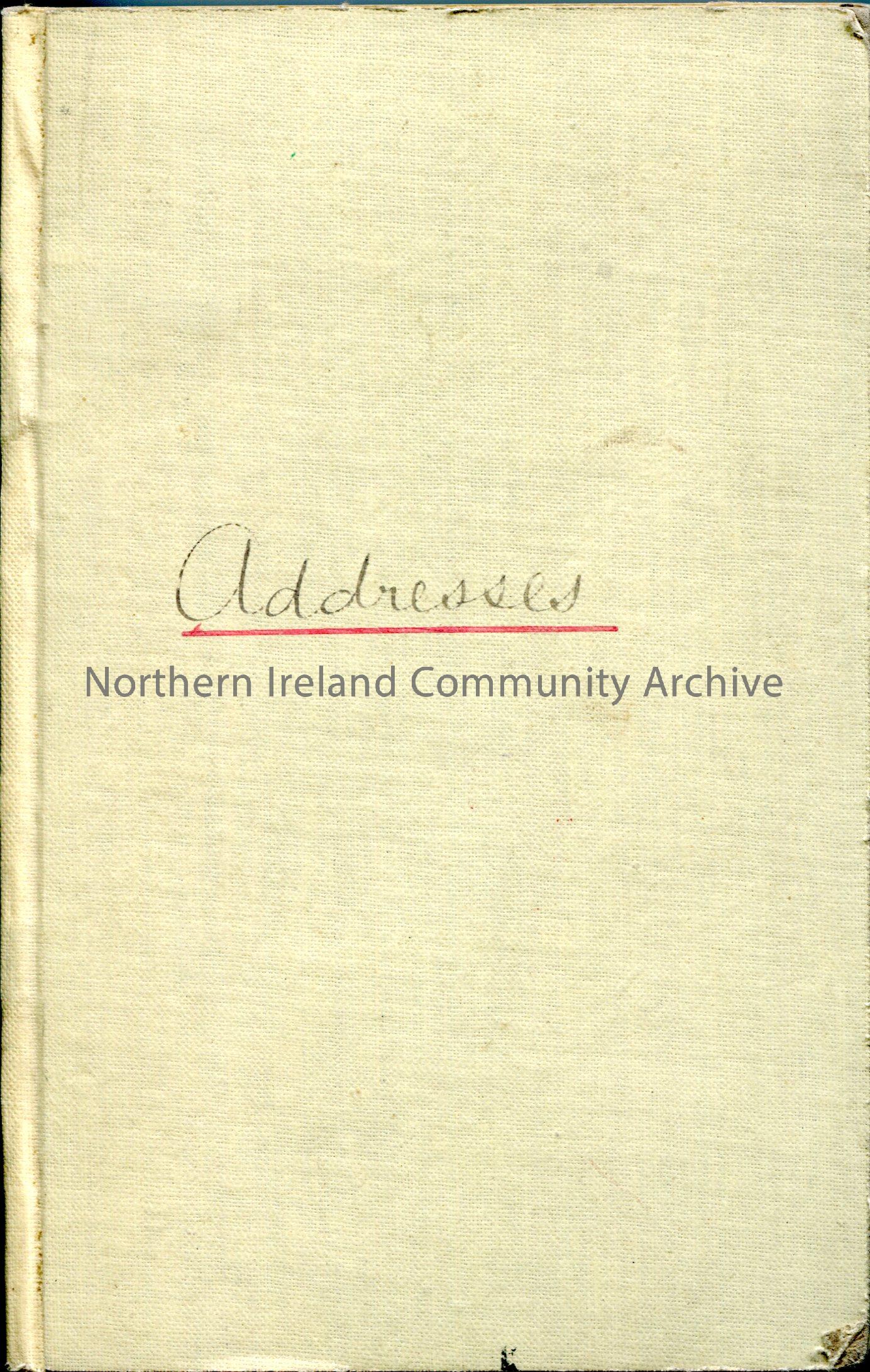 Notebook with 'Addresses' handwritten on front cover. 'Supplied for the Public Service' stamped on inside cover. Various addresses for persons in the North of Ireland, England, Scotland and America. Names and addresses of army servicemen. Draft of a letter to 'Emma' handwritten on back page in pencil, giving sympathies for the loss of her father. Several loose cuttings with addresses in between pages.