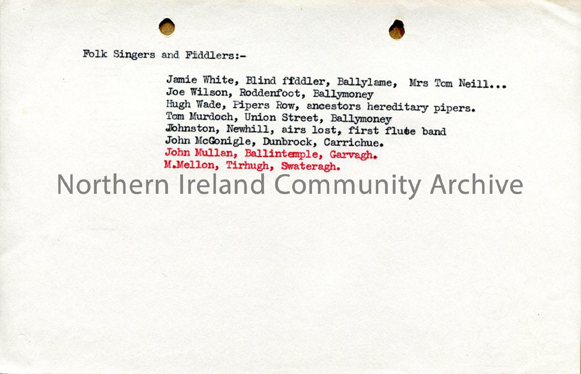 Typed notes - 'Folk Singers and Fiddlers' - names and location.