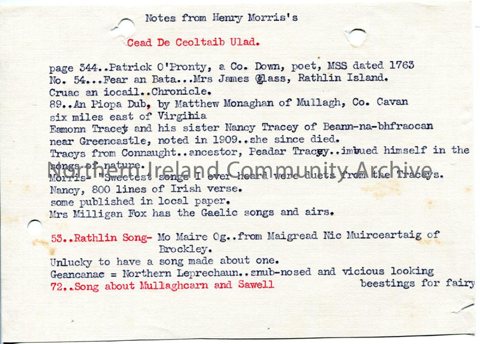 Typed brief notes under heading 'Notes from Henry Morris's' -page numbers and names, and short notes against them about songs, singing.