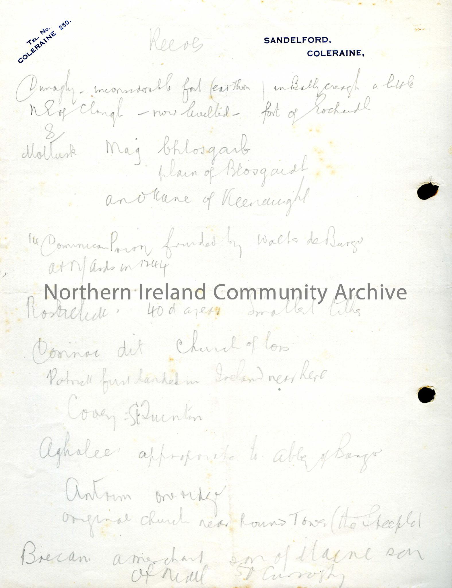 Notes handwritten in pencil and headed "Reeves". Reeves was an Irish antiquarian and the notes seem to be taken from his writings. There is reference to an earthen fort in Dunaghy and a priory founded at Ards by Walter de Burgo among other things. The notes continue on the reverse side and include Patrick, Mochay of Nendrum, Carbreus of Coleraine and Conal of Coleraine.