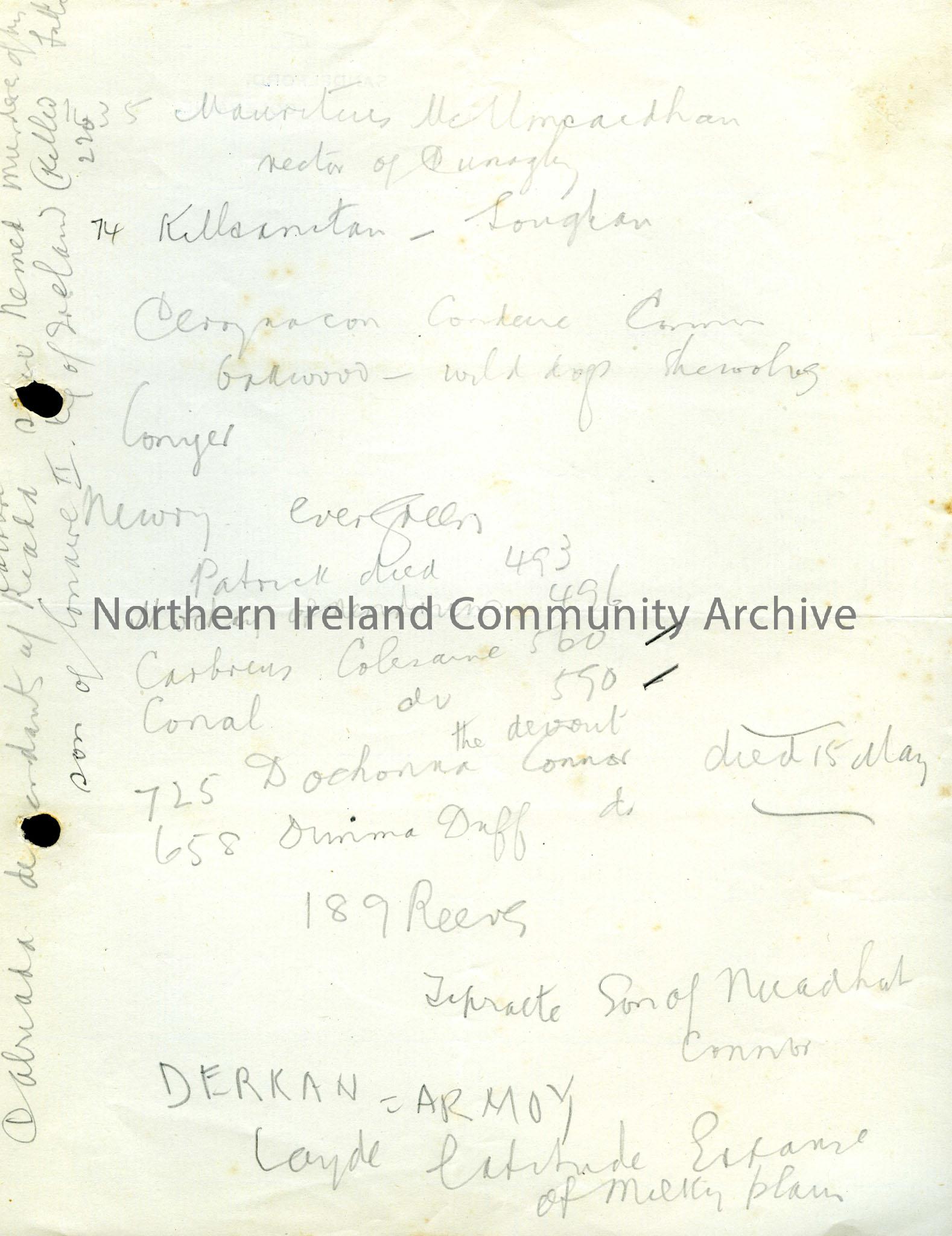 Notes handwritten in pencil and headed "Reeves". Reeves was an Irish antiquarian and the notes seem to be taken from his writings. There is reference to an earthen fort in Dunaghy and a priory founded at Ards by Walter de Burgo among other things. The notes continue on the reverse side and include Patrick, Mochay of Nendrum, Carbreus of Coleraine and Conal of Coleraine.