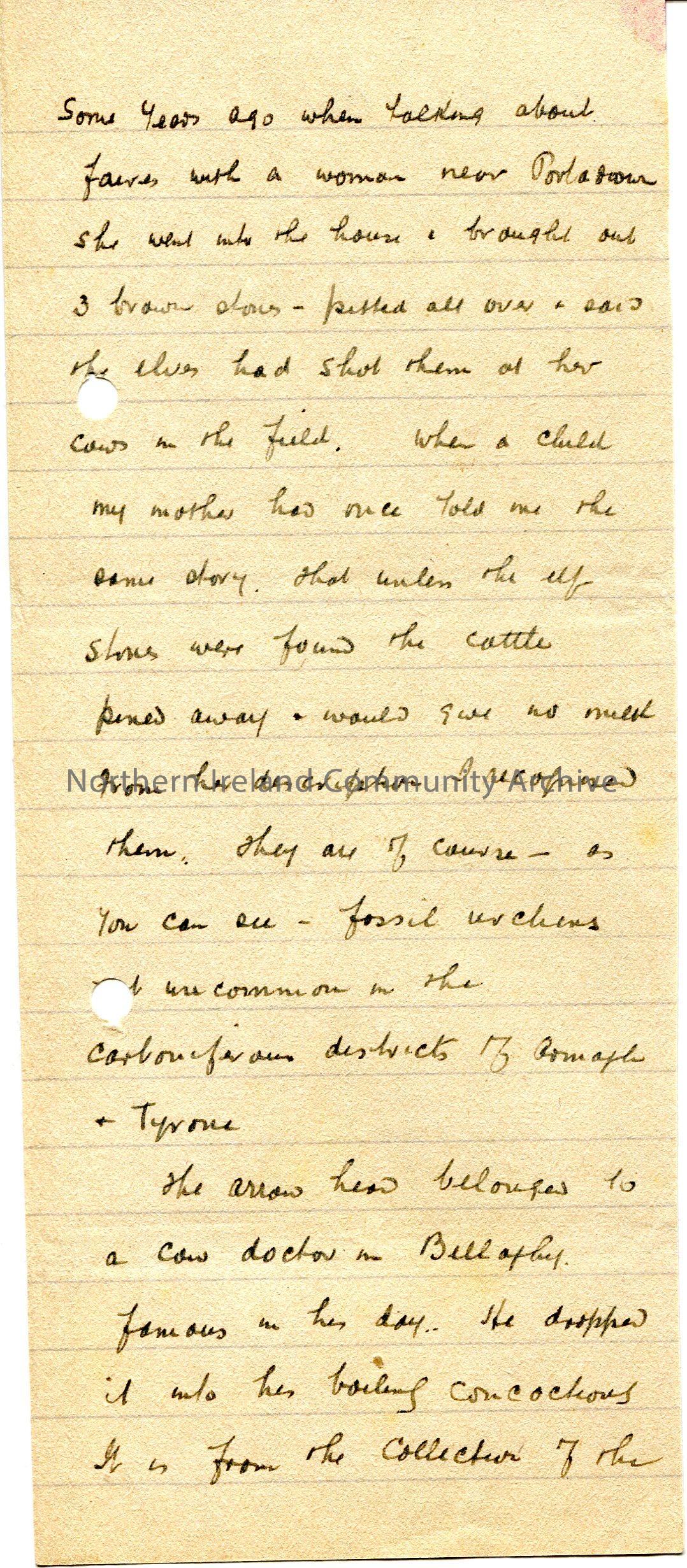 Notes handwritten on lined paper re folklore. Writes of a pitted stone of which the elves has shot them at cows in a field. They were actually fossil …