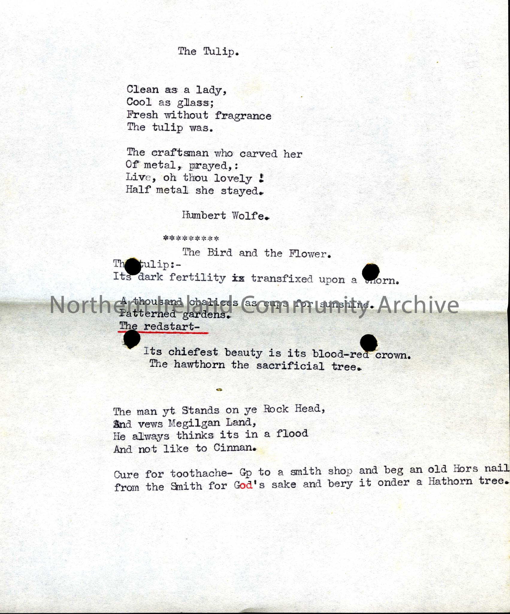 Notes including a poem entitled “The Tulip” by Humbert Wolfe, a quotation on the redstart, a verse on Magilligan and a folklore cure for toothache.