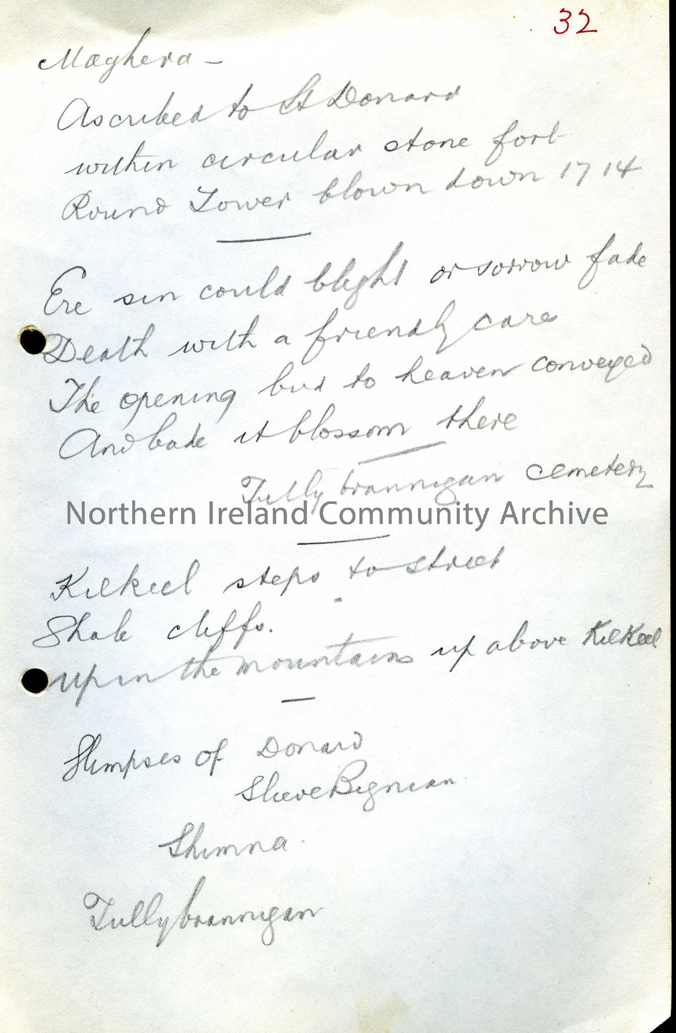 Notes on Co. Down that mention A round tower at Maghera and Tullybrannigan cemetery.