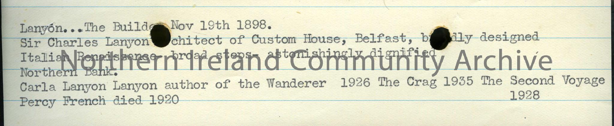 Notes on Sir Charles Lanyon architect of the Custom House in Belfast and on Clara Lanyon Lanyon author of "The Wanderer", "The Crag" and "The Second Voyage". The date of the death of Percy French in 1920 is also included.