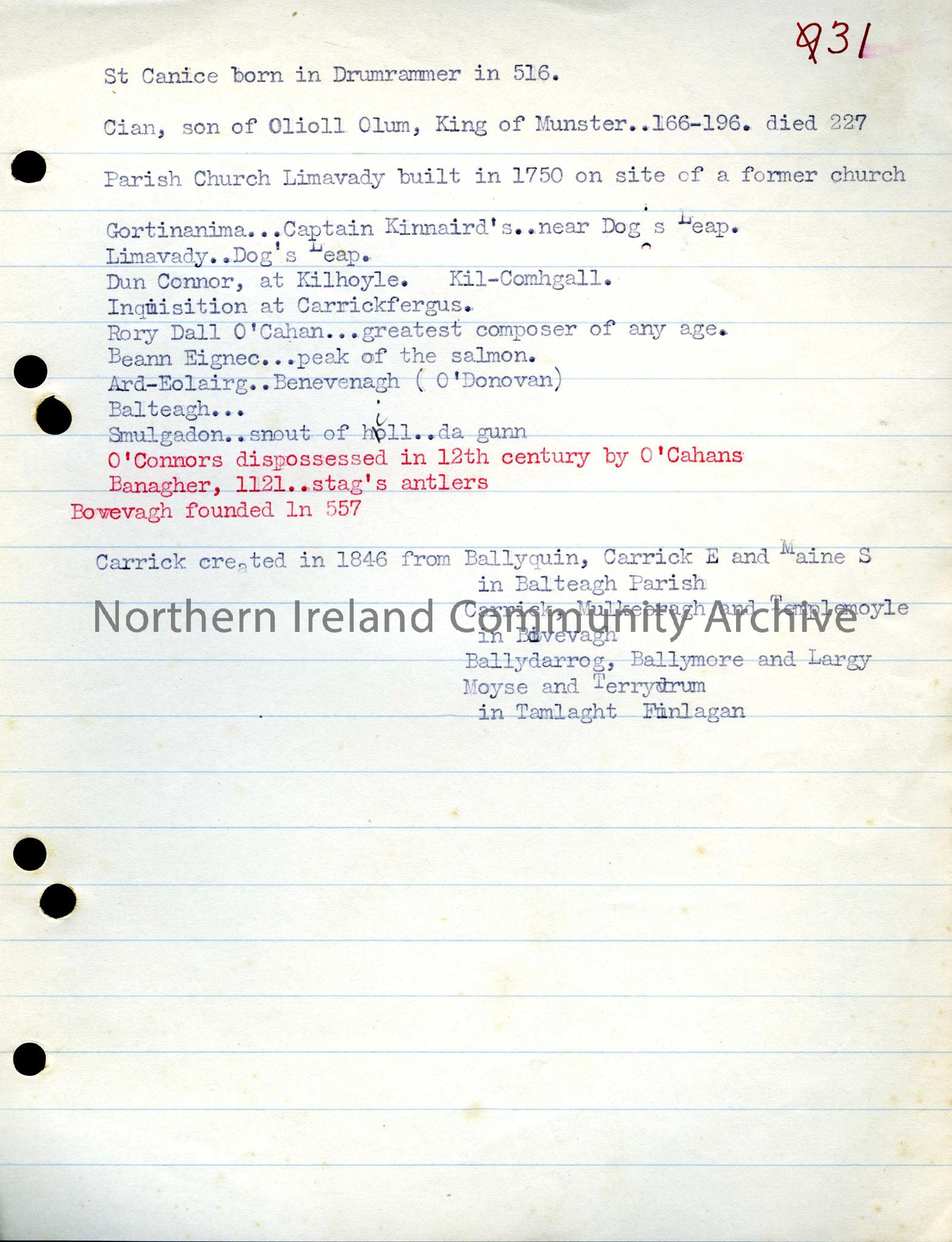 Notes on St. Canice, The O'Connors and the O'Cahans and the Limavady area.