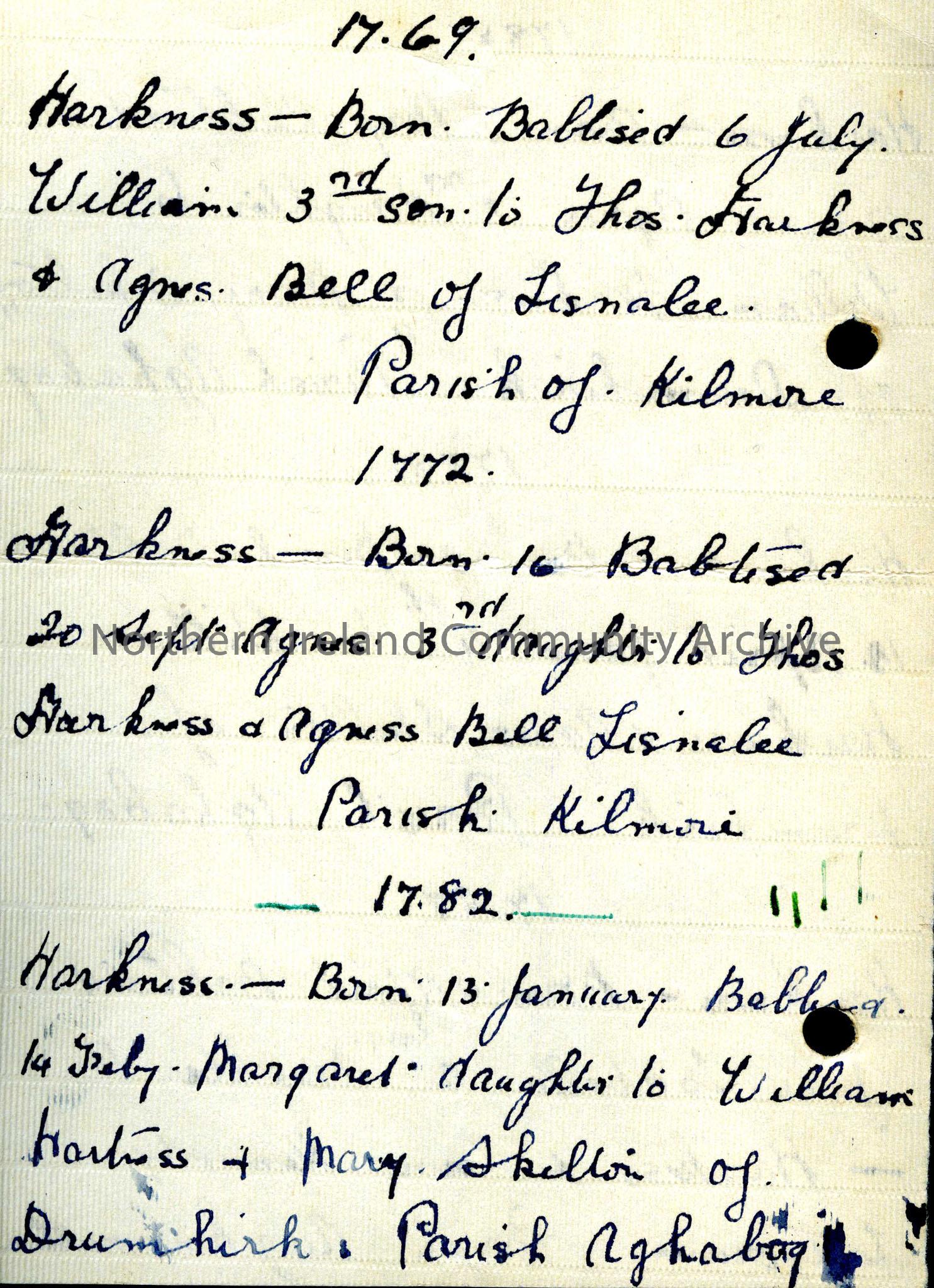 Notes on the Harkness family of Co. Monaghan listing births between 1769 and 1797
