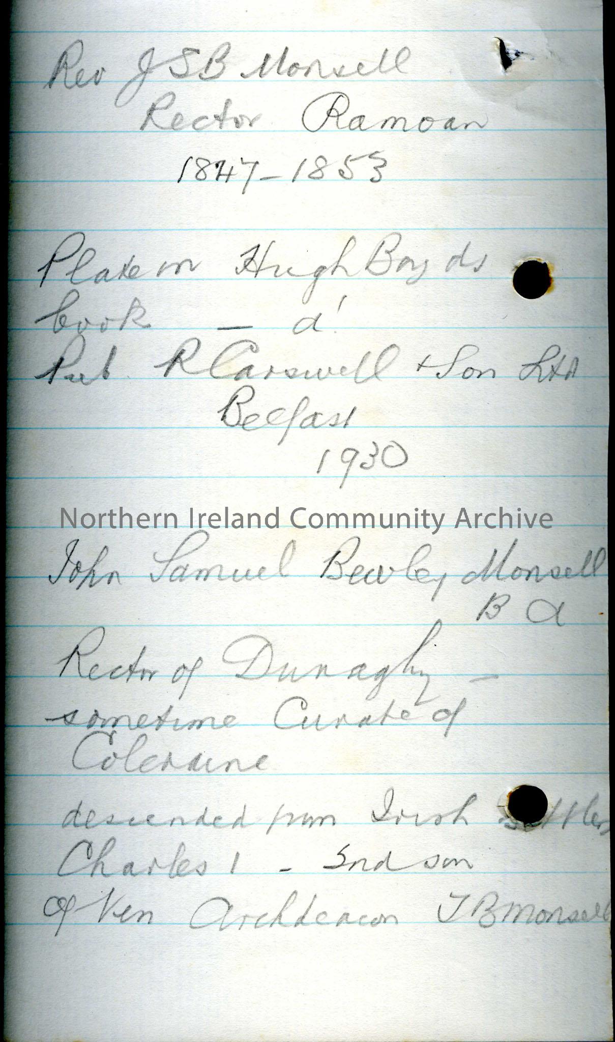 Notes on the Monsell Family beginning with Thomas B. Monsell, M.A., Archdeacon of Derry and former Rector of Dunboe. A memorial tablet in Derry Cathedral and a memorial window in Ramoan church are mentioned. On the reverse side there are details of the life and career of his son, Rev. John Samuel Bewley Monsell, B.A. who was rector of Dunaghy and sometime curate of Coleraine.