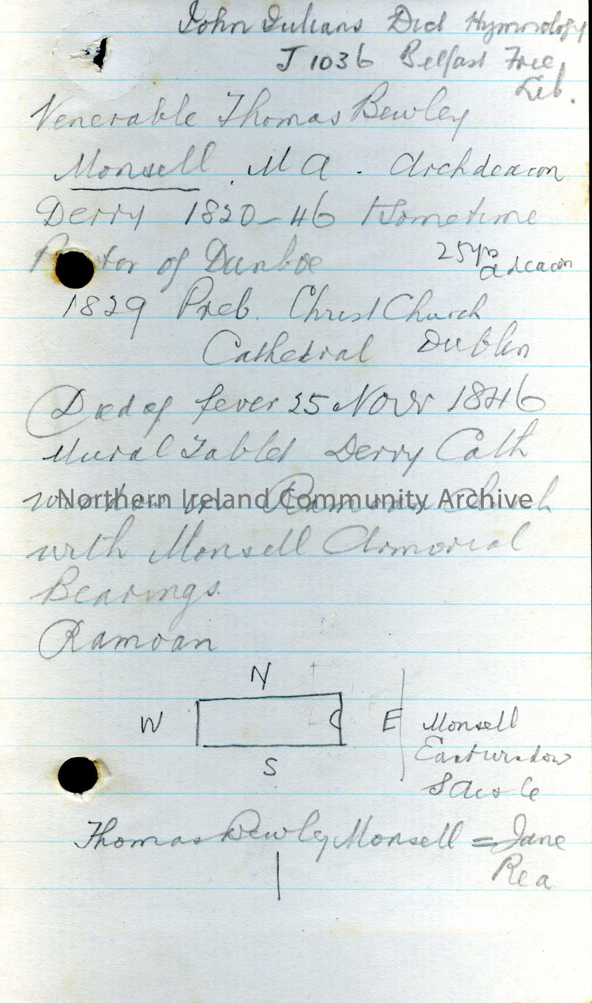 Notes on the Monsell Family beginning with Thomas B. Monsell, M.A., Archdeacon of Derry and former Rector of Dunboe. A memorial tablet in Derry Cathedral and a memorial window in Ramoan church are mentioned. On the reverse side there are details of the life and career of his son, Rev. John Samuel Bewley Monsell, B.A. who was rector of Dunaghy and sometime curate of Coleraine.
