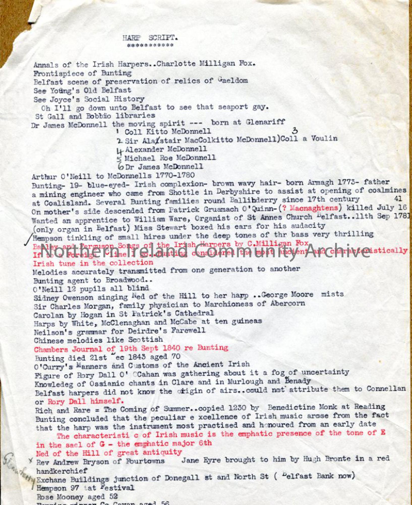 Typed notes, with additional handwritten notes, entitled 'Harp Script' - appears to be notes for script rather than script itself, including information on Rory Dall O'Cahan, Scottish links - mentions Bunting, Hempson.