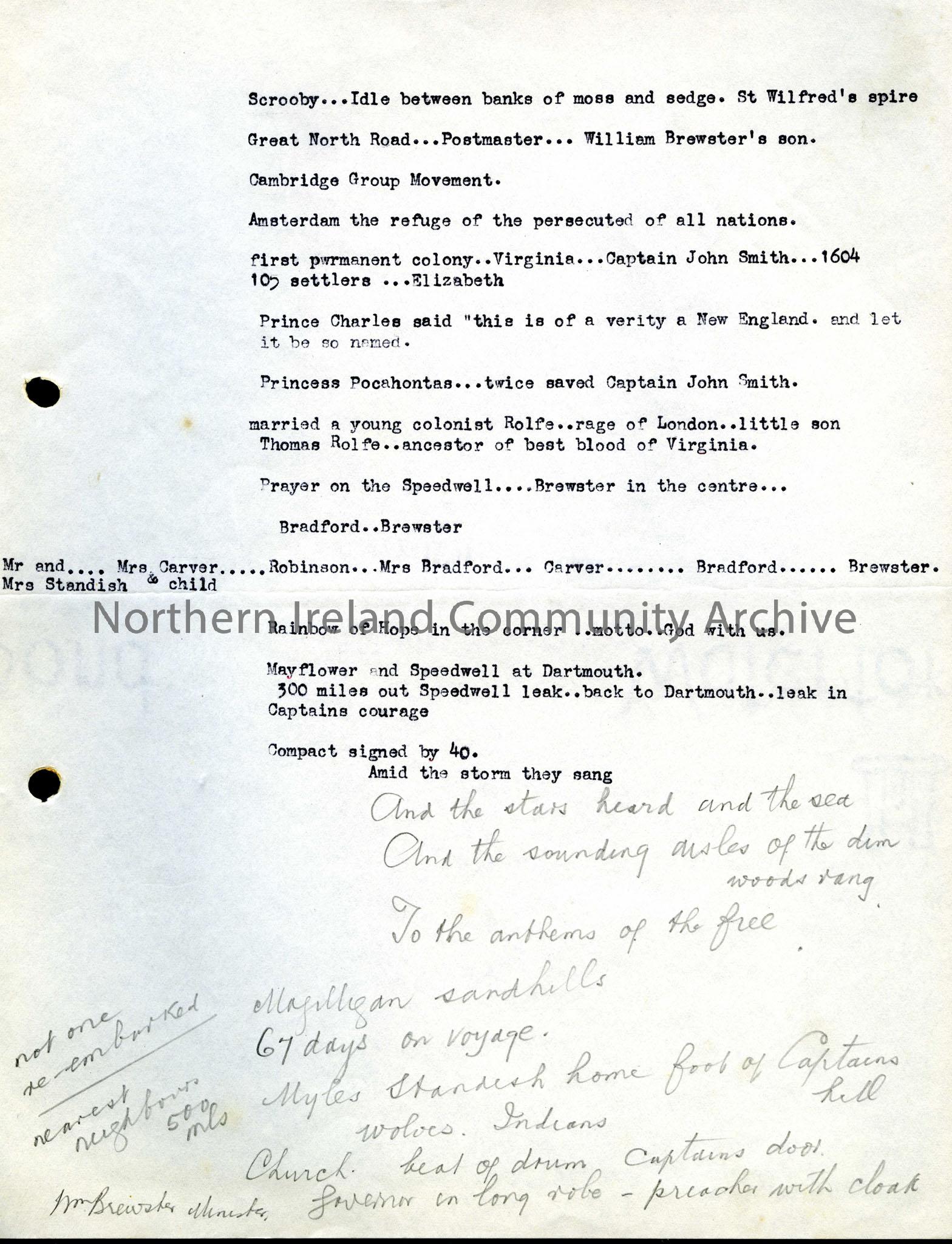 Notes possibly for a talk relating to early settlers in America. There is mention of religious persecution, of John Smith and Pocahontas and the Mayflower and the Speedwell.