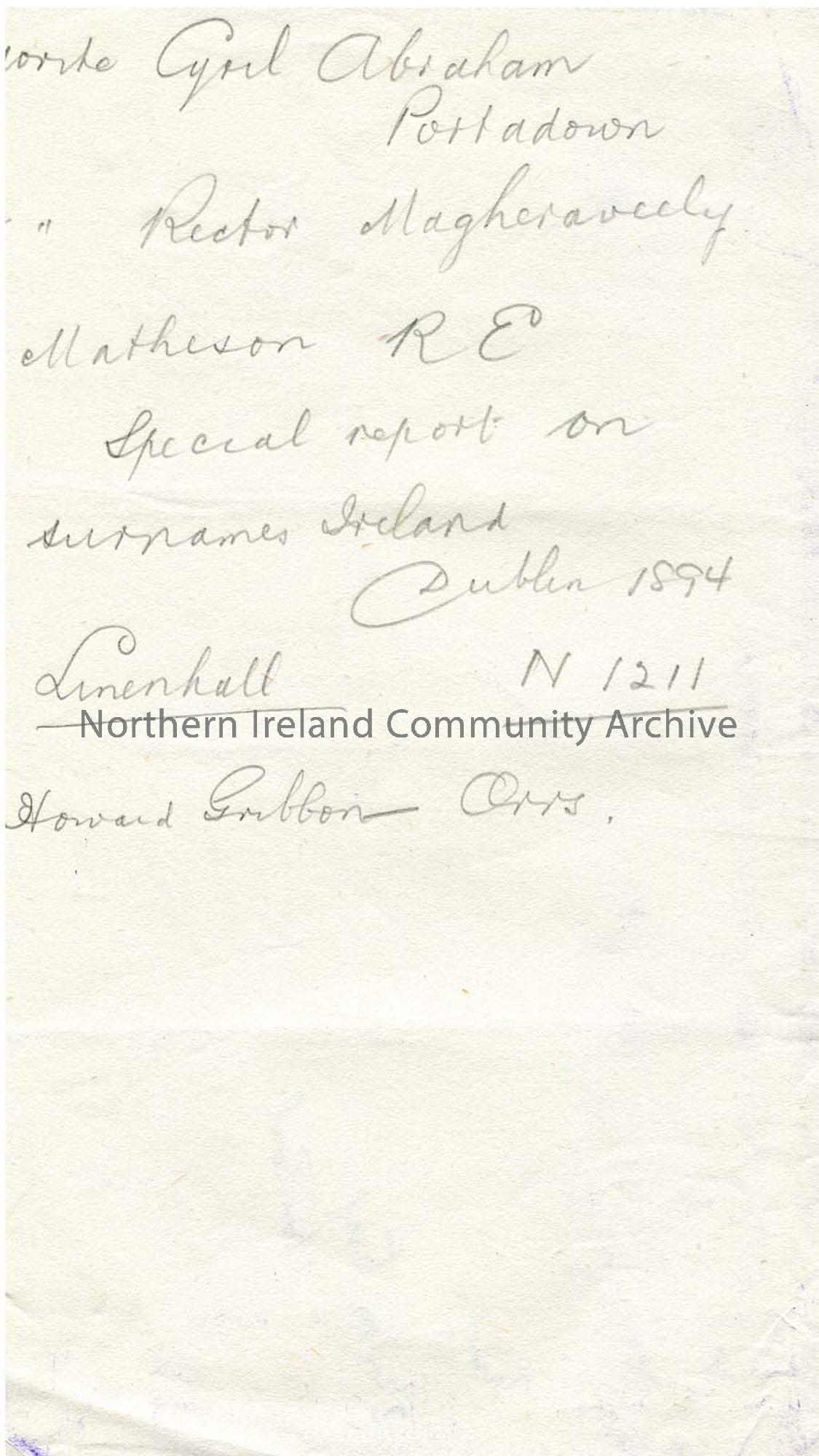 Handwritten notes in pencil re genealogy of James Johnston Abraham. Sam Henry assisted him in research for an autobiography.