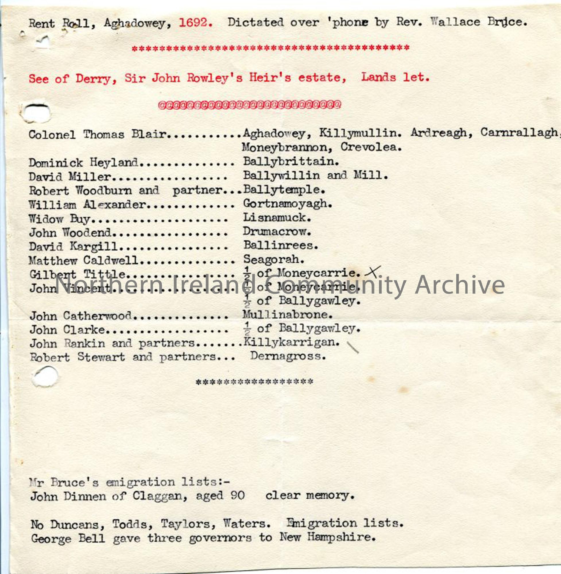 Typed notes re: Aghadowey Rent Roll 1692 - 'See of Derry, Sir John Rowley's Heir's Estate, Lands Let' - list of names against area let. Dictated over the phone by Rev. Wallace Brice/Bruce?