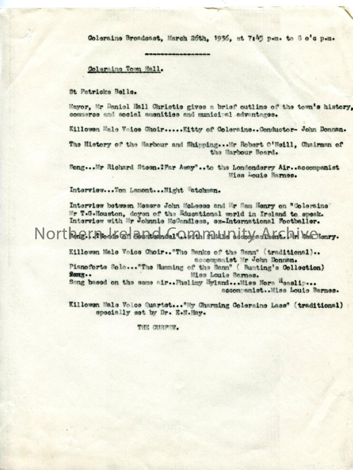 Typed notes relating to 'Coleraine Broadcast', giving date and time equating to 'Provincial Journey' programme. Outlines programme - sequence, songs, speakers and subject. Ends with 'The Curfew'.