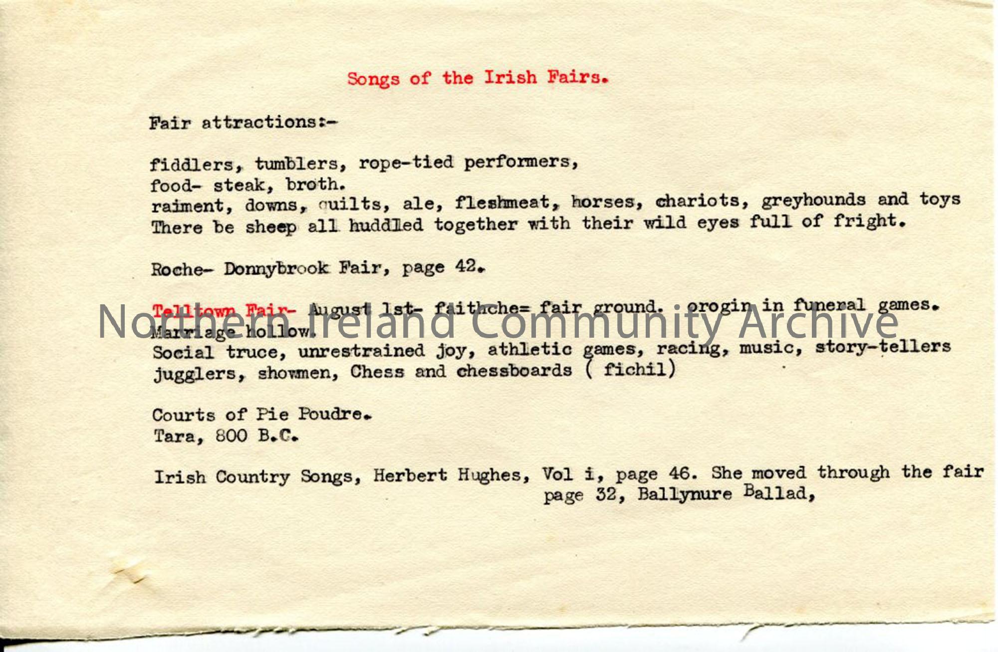 Typed brief notes under heading 'Songs of the Irish Fairs' relating to fair attractions, Telltown Fair.