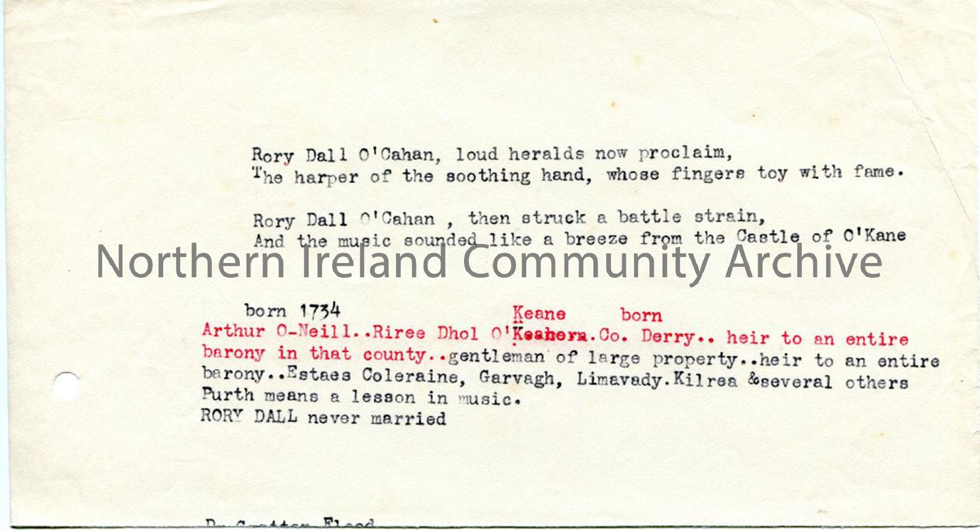 Typed words to lines of song about Rory Dall O'Cahan and some notes about him.