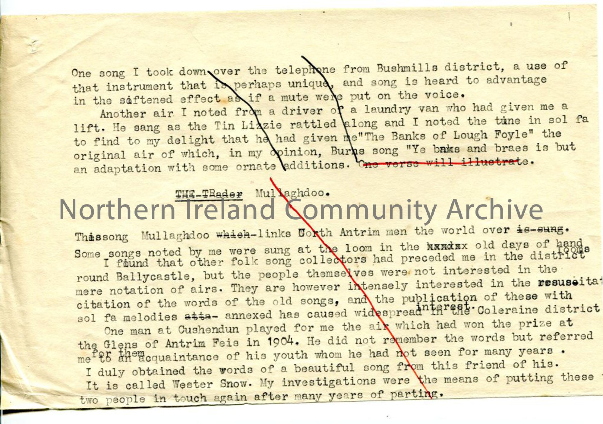 Typed paragraphs with line through - part of whole - remainder absent. Relates to songs from Ballycastle and Bushmills district. States opinion on Burns song being adaptation of 'The Banks of Lough Foyle'.