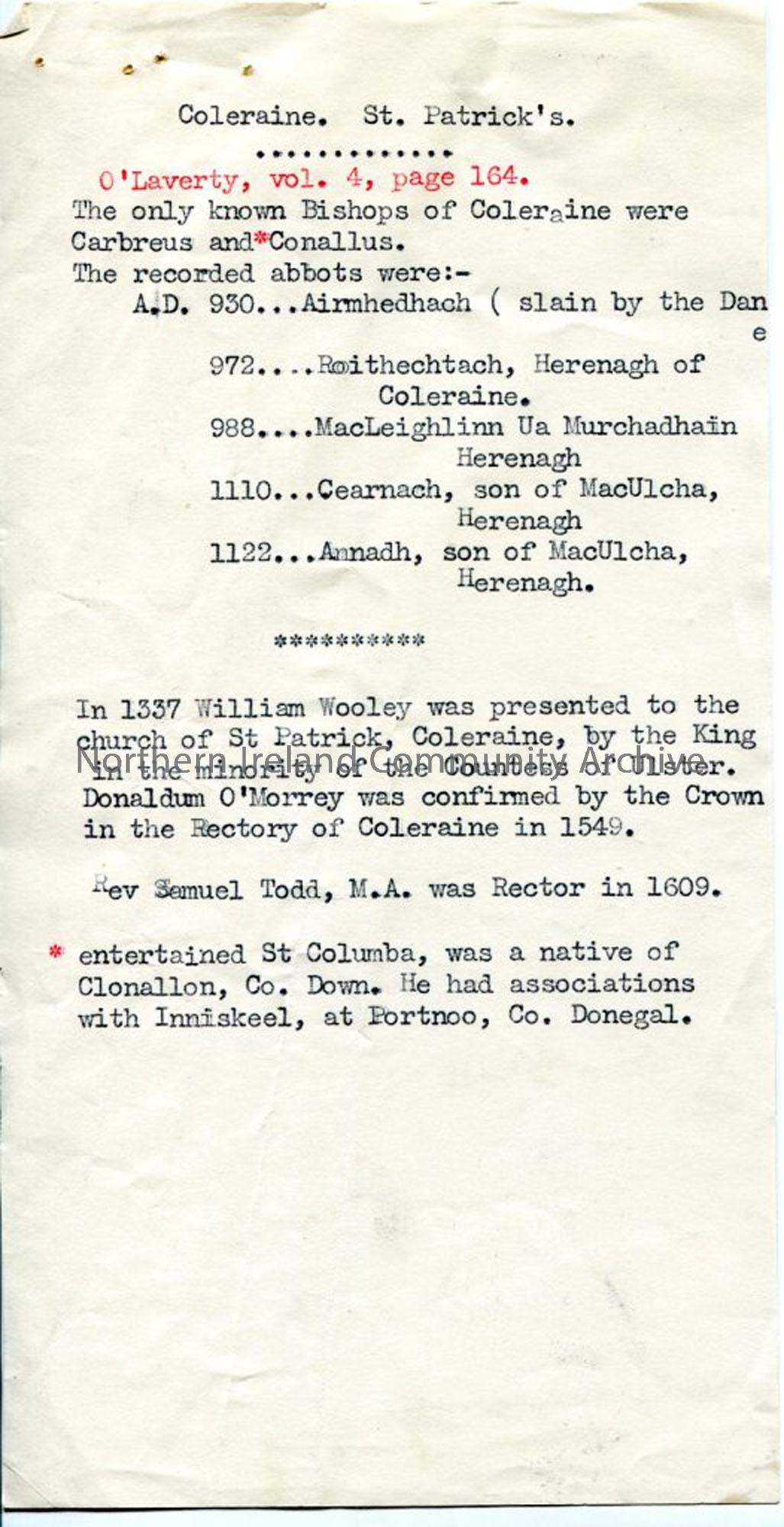 Typed notes re: St Patrick's Church in Coleraine, ancient bishops of Coleraine, 14th and 16th century incumbents.