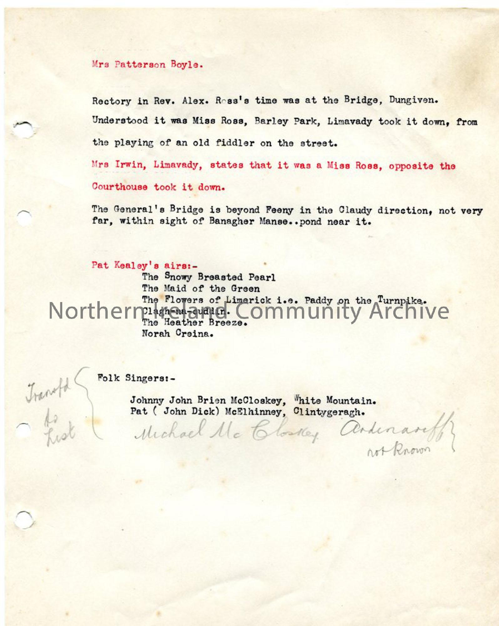 Typed notes relating to songs and donors, with the origins of the songs. Mentions Mrs Patterson Boyle, Miss Ross, Pat Kealey.