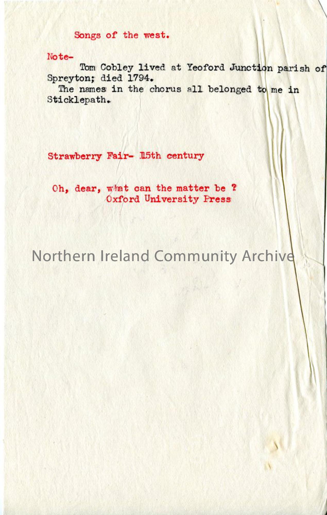 Typed brief notes under heading 'Songs of the West' - contains a note about Tom Cobley - a name in chorus of 'Widecombe Fair'.